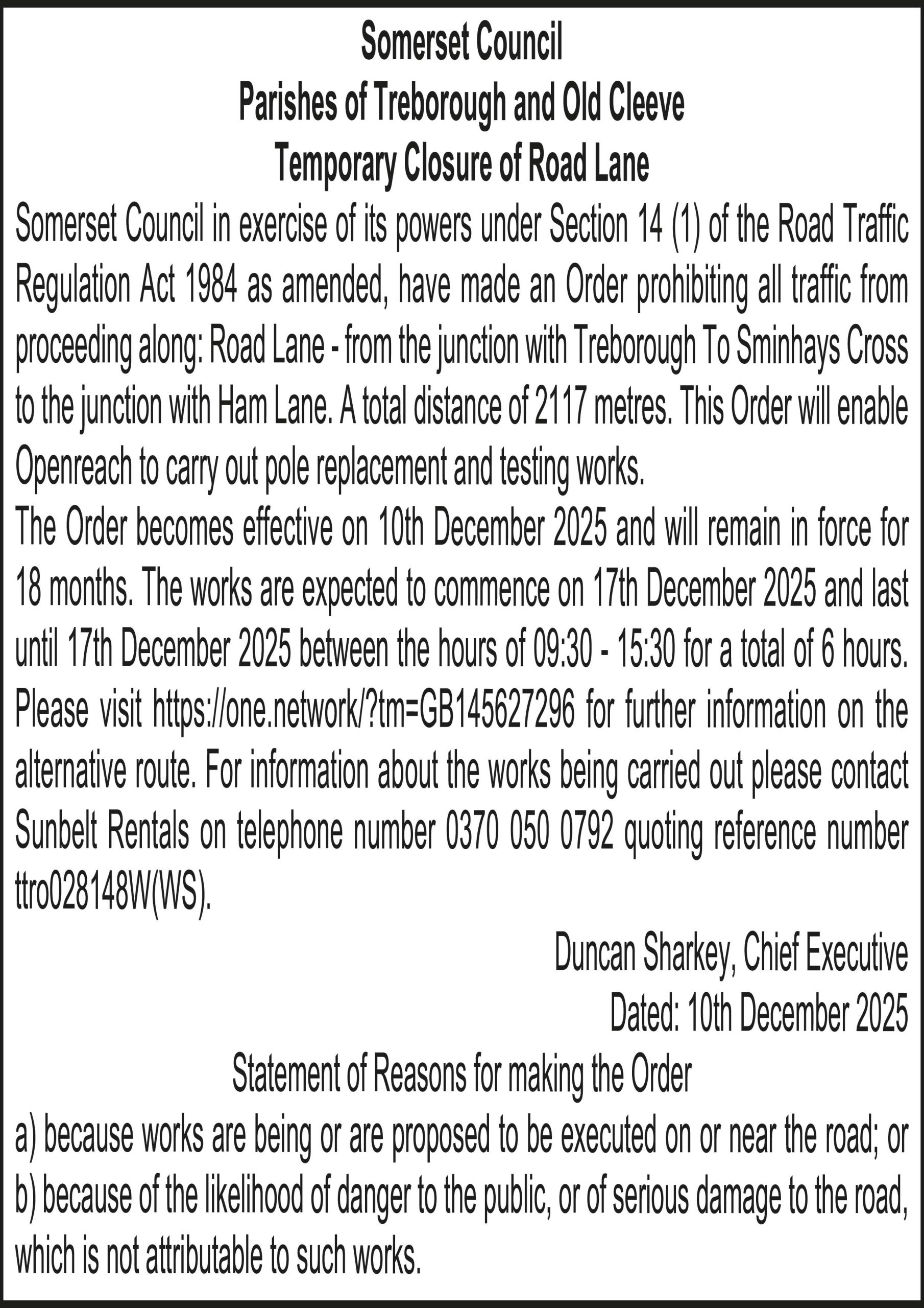Somerset Council in exercise of its powers under Section 14 (1) of the Road Traffic Regulation Act 1984 as amended, have made an Order prohibiting all traffic from proceeding along: Road Lane – from the junction with Treborough To Sminhays Cross to the junction with Ham Lane. A total distance of 2117 metres. This Order will enable Openreach to carry out pole replacement and testing works.