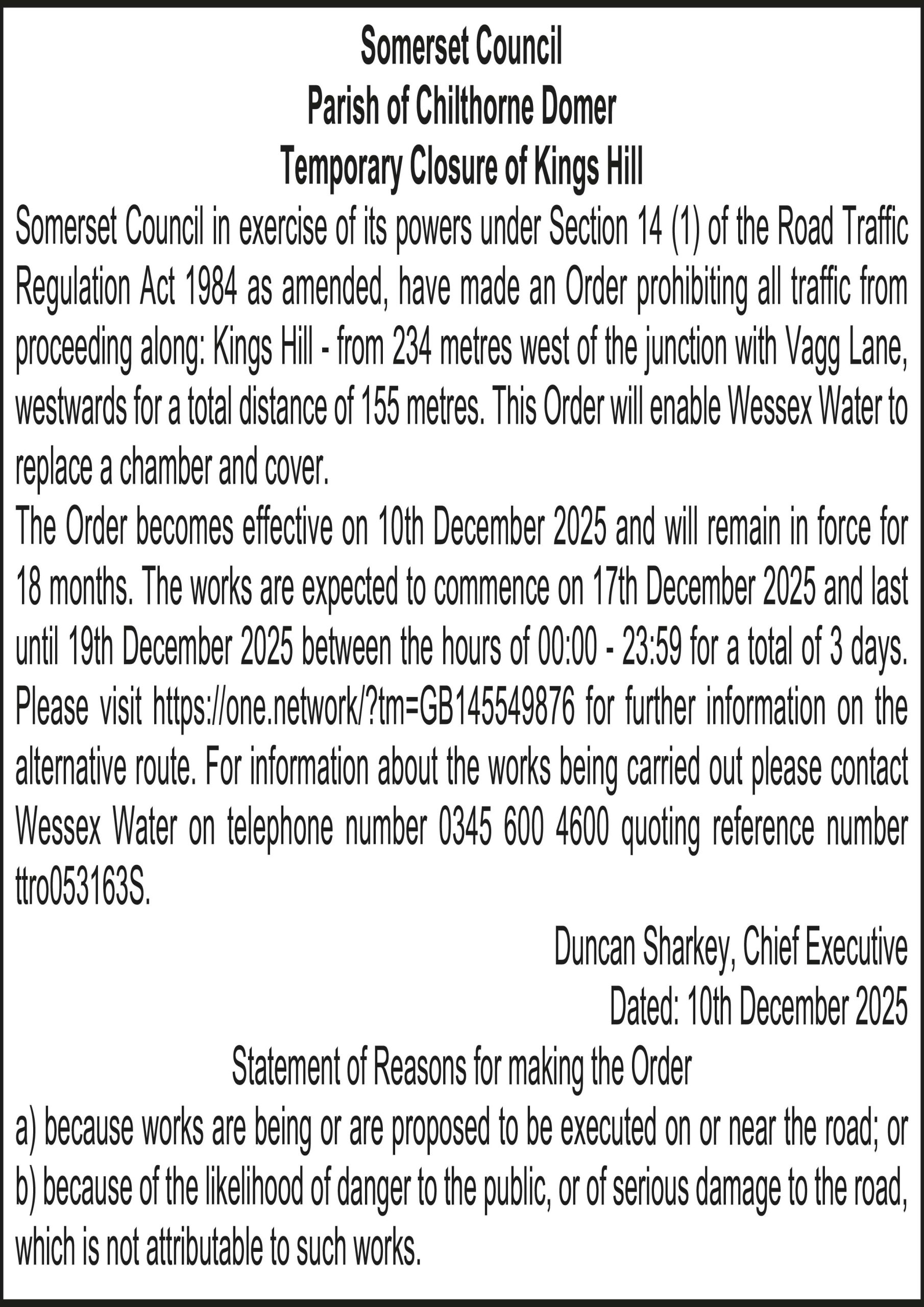 Somerset Council in exercise of its powers under Section 14 (1) of the Road Traffic Regulation Act 1984 as amended, have made an Order prohibiting all traffic from proceeding along: Kings Hill – from 234 metres west of the junction with Vagg Lane, westwards for a total distance of 155 metres. This Order will enable Wessex Water to replace a chamber and cover.