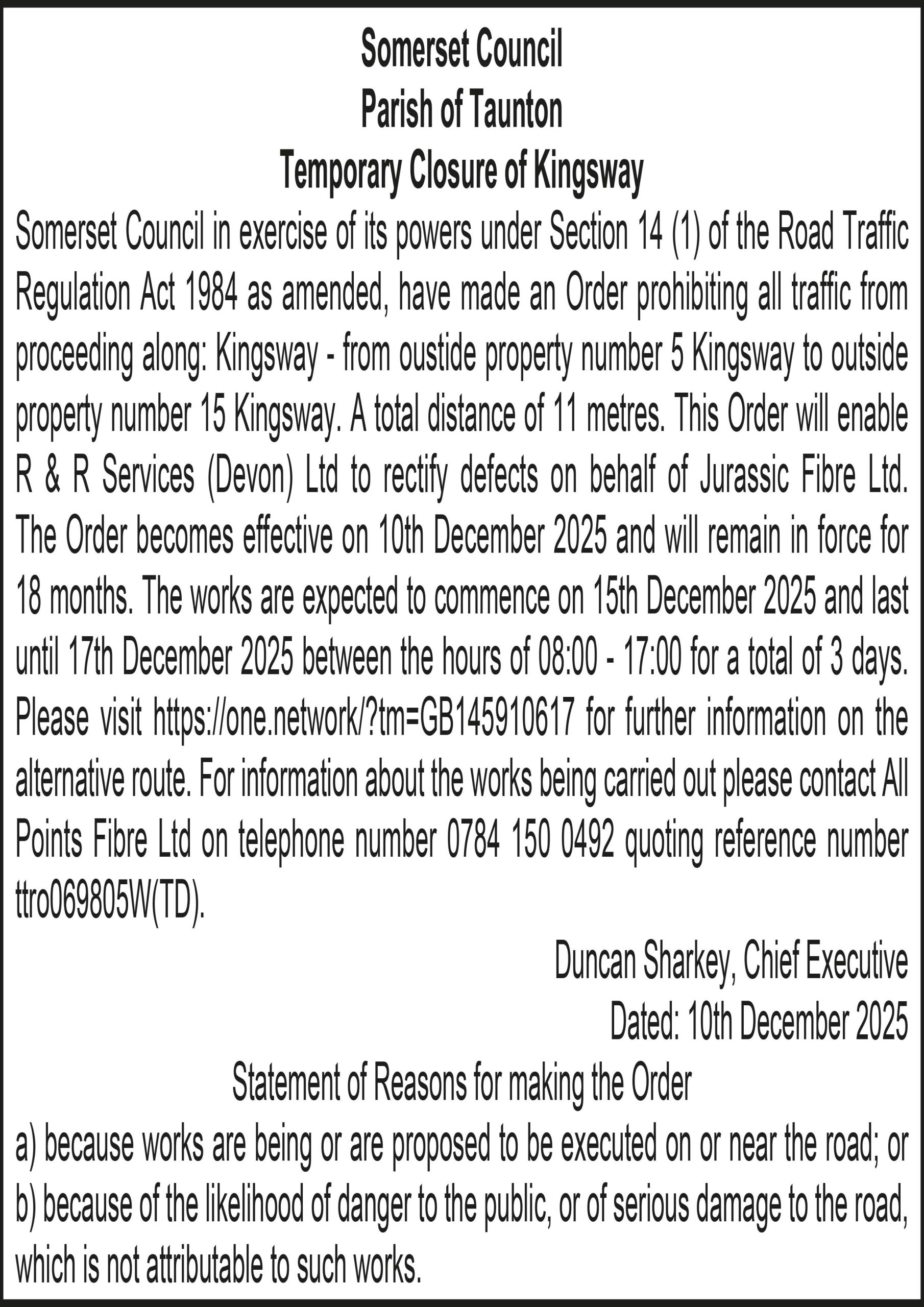 Somerset Council in exercise of its powers under Section 14 (1) of the Road Traffic Regulation Act 1984 as amended, have made an Order prohibiting all traffic from proceeding along: Kingsway – from outside property number 5 Kingsway to outside property number 15 Kingsway. A total distance of 11 metres. This Order will enable R & R Services (Devon) Ltd to rectify defects on behalf of Jurassic Fibre Ltd.