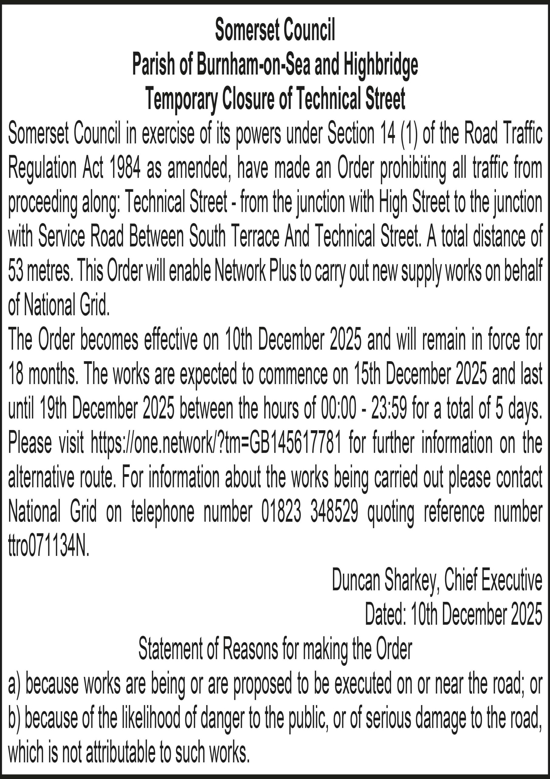 The Order becomes effective on 10th December 2025 and will remain in force for 18 months. The works are expected to commence on 15th December 2025 and last until 19th December 2025 between the hours of 00:00 – 23:59 for a total of 5 days. Please visit https://one.network/?tm=GB145617781 for further information on the alternative route. For information about the works being carried out please contact National Grid on telephone number 01823 348529 quoting reference number ttro071134N.