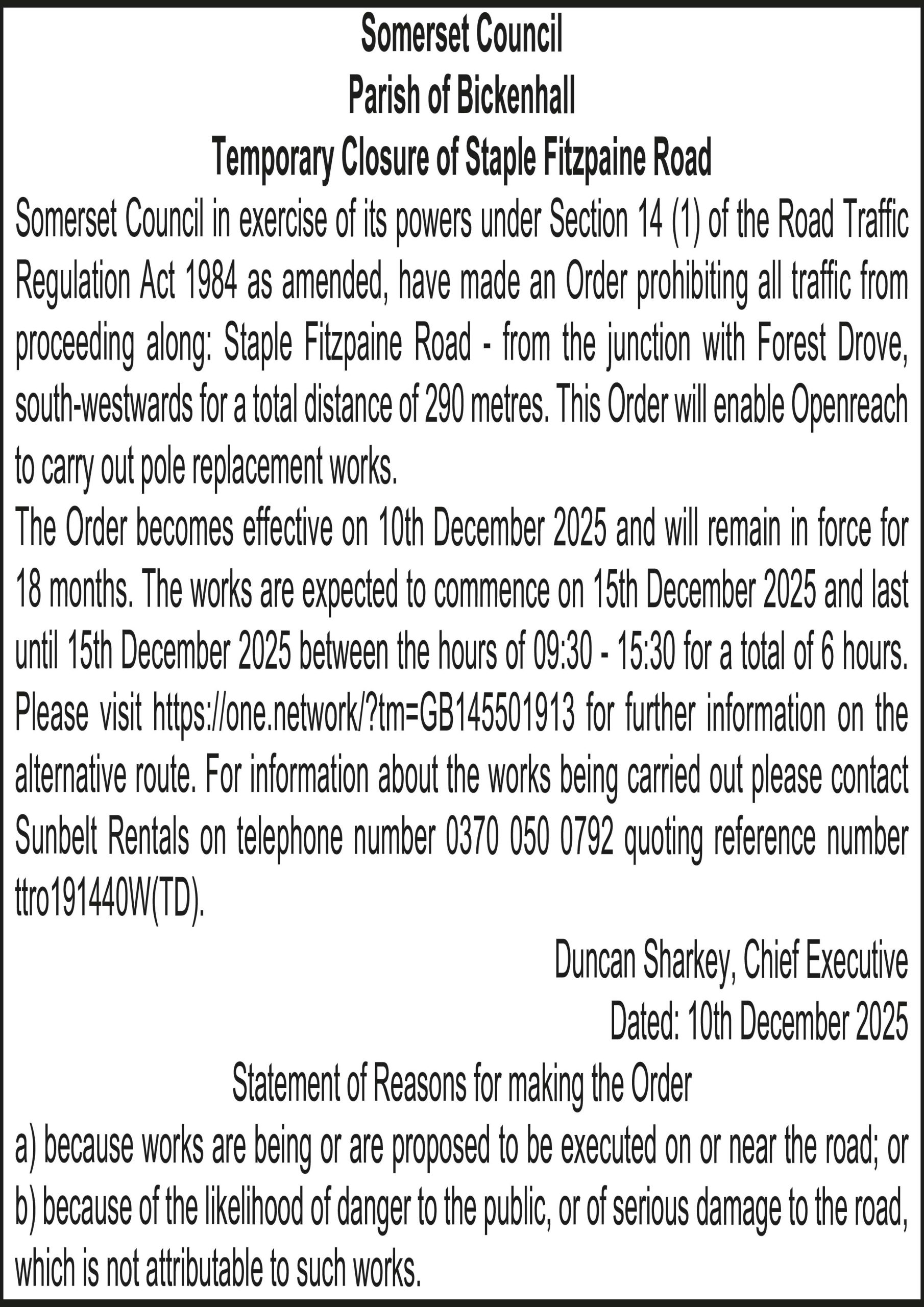 Somerset Council in exercise of its powers under Section 14 (1) of the Road Traffic Regulation Act 1984 as amended, have made an Order prohibiting all traffic from proceeding along: Staple Fitzpaine Road – from the junction with Forest Drove, south-westwards for a total distance of 290 metres. This Order will enable Openreach to carry out pole replacement works.