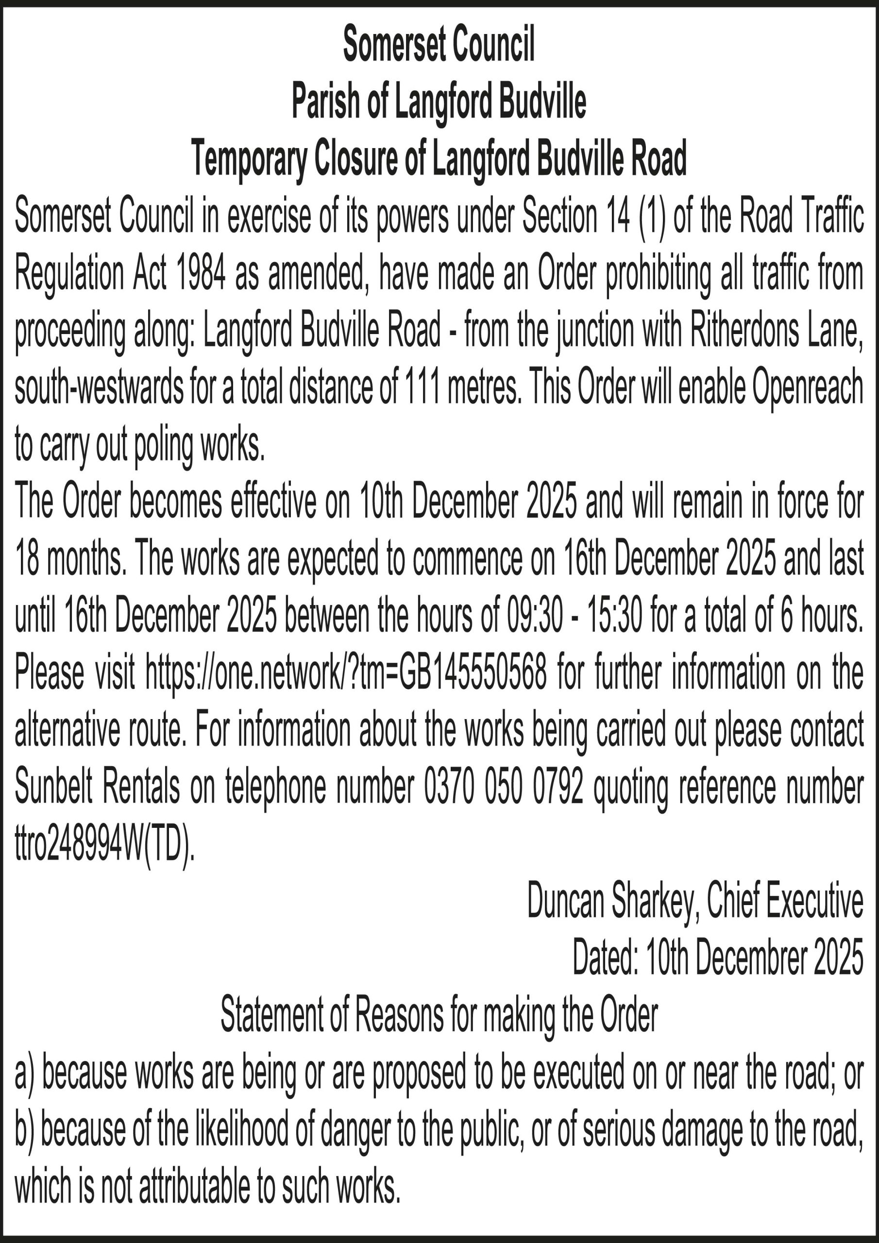 Somerset Council in exercise of its powers under Section 14 (1) of the Road Traffic Regulation Act 1984 as amended, have made an Order prohibiting all traffic from proceeding along: Langford Budville Road – from the junction with Ritherdons Lane, south-westwards for a total distance of 111 metres. This Order will enable Openreach to carry out poling works.