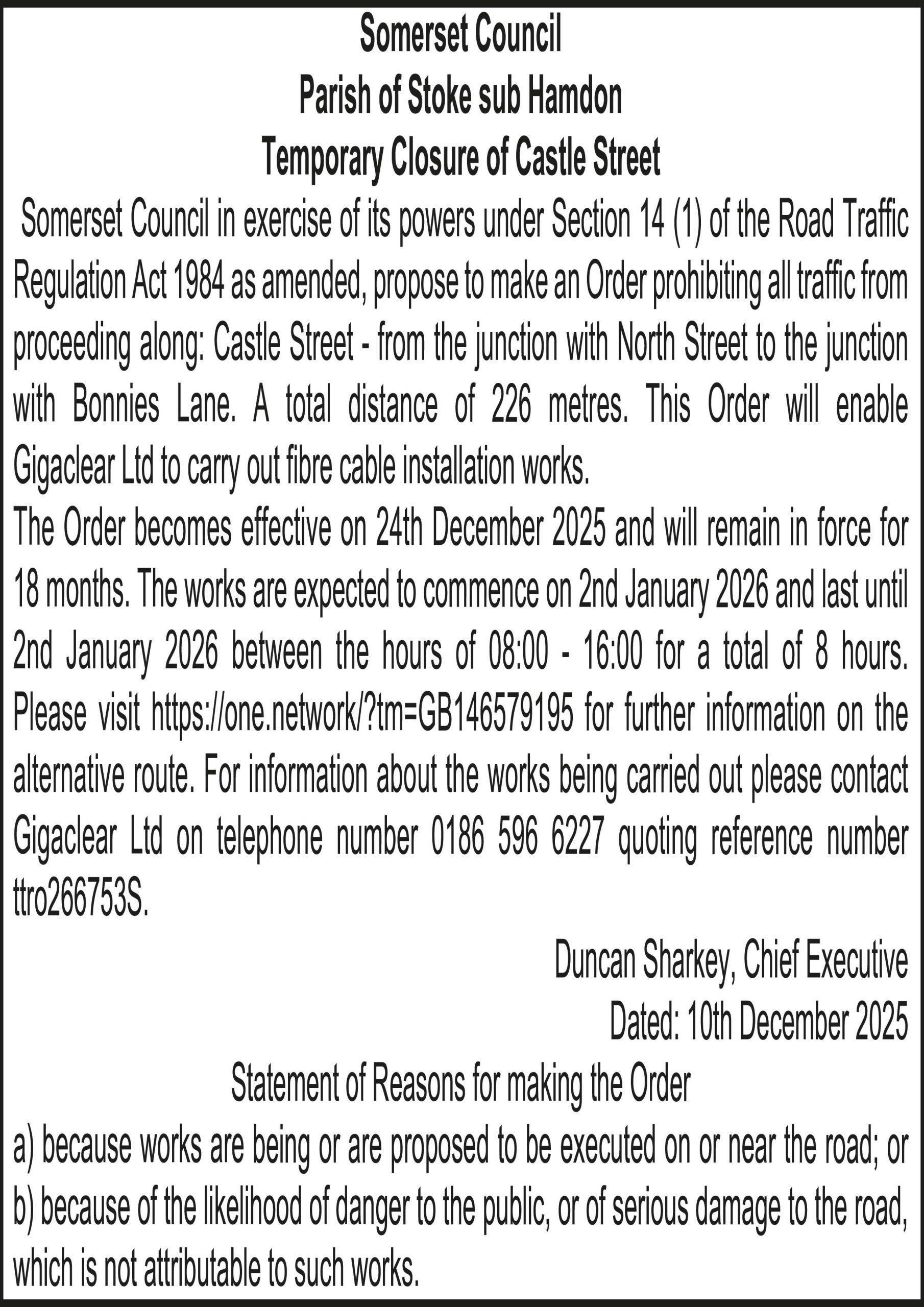 The Order becomes effective on 24th December 2025 and will remain in force for 18 months. The works are expected to commence on 2nd January 2026 and last until 2nd January 2026 between the hours of 08:00 – 16:00 for a total of 8 hours. Please visit https://one.network/?tm=GB146579195 for further information on the alternative route. For information about the works being carried out please contact Gigaclear Ltd on telephone number 0186 596 6227 quoting reference number ttro266753S.