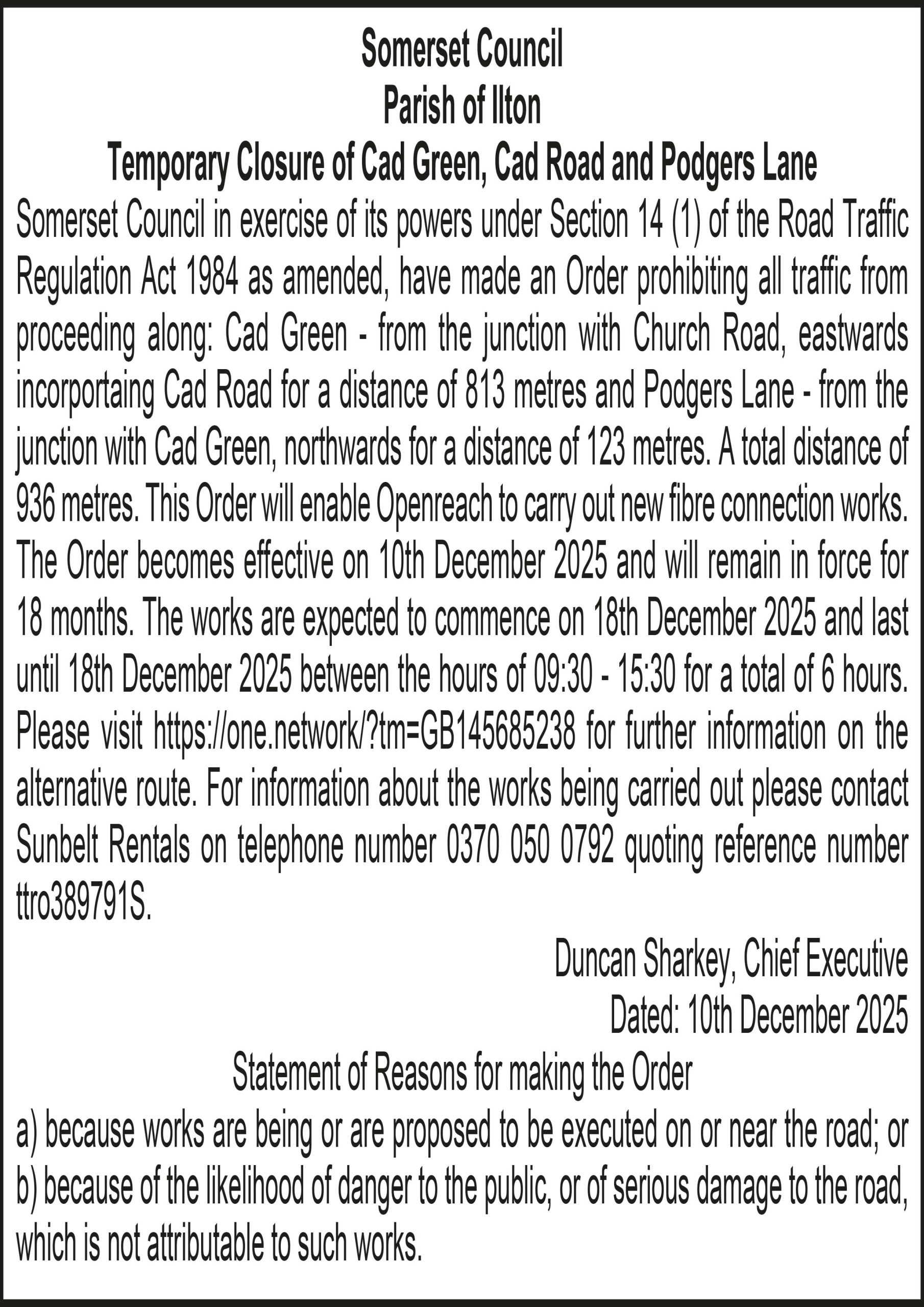 Somerset Council in exercise of its powers under Section 14 (1) of the Road Traffic Regulation Act 1984 as amended, have made an Order prohibiting all traffic from proceeding along: Cad Green – from the junction with Church Road, eastwards incorporating Cad Road for a distance of 813 metres and Podgers Lane – from the junction with Cad Green, northwards for a distance of 123 metres. A total distance of 936 metres. This Order will enable Openreach to carry out new fibre connection works.