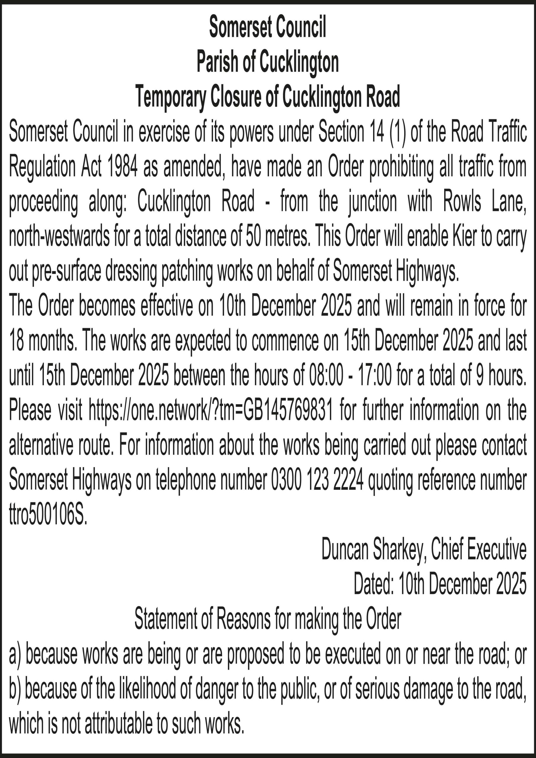 Somerset Council in exercise of its powers under Section 14 (1) of the Road Traffic Regulation Act 1984 as amended, have made an Order prohibiting all traffic from proceeding along: Cucklington Road – from the junction with Rowls Lane, north-westwards for a total distance of 50 metres. This Order will enable Kier to carry out pre-surface dressing patching works on behalf of Somerset Highways.