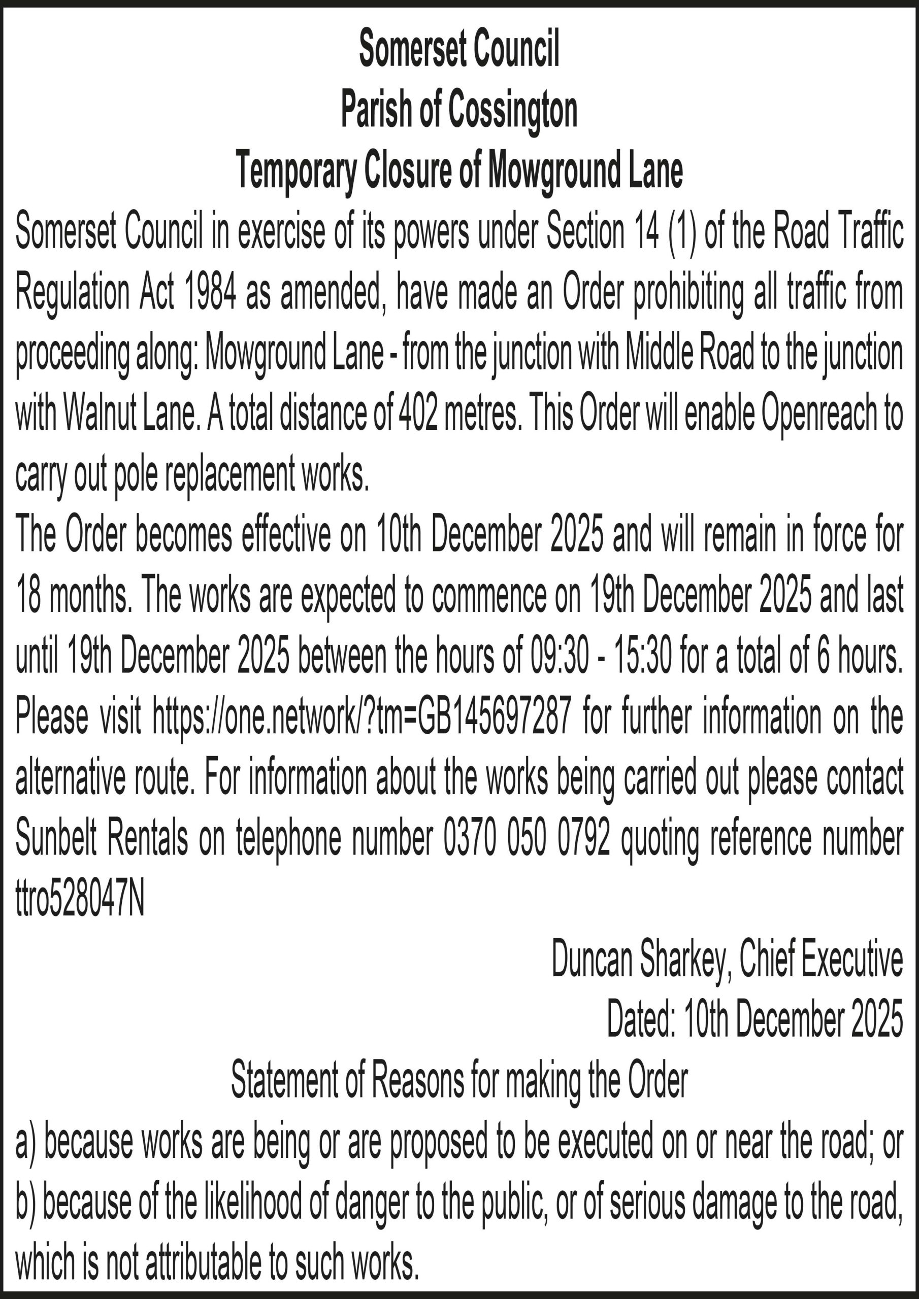 Somerset Council in exercise of its powers under Section 14 (1) of the Road Traffic Regulation Act 1984 as amended, have made an Order prohibiting all traffic from proceeding along: Mowground Lane – from the junction with Middle Road to the junction with Walnut Lane. A total distance of 402 metres. This Order will enable Openreach to carry out pole replacement works.