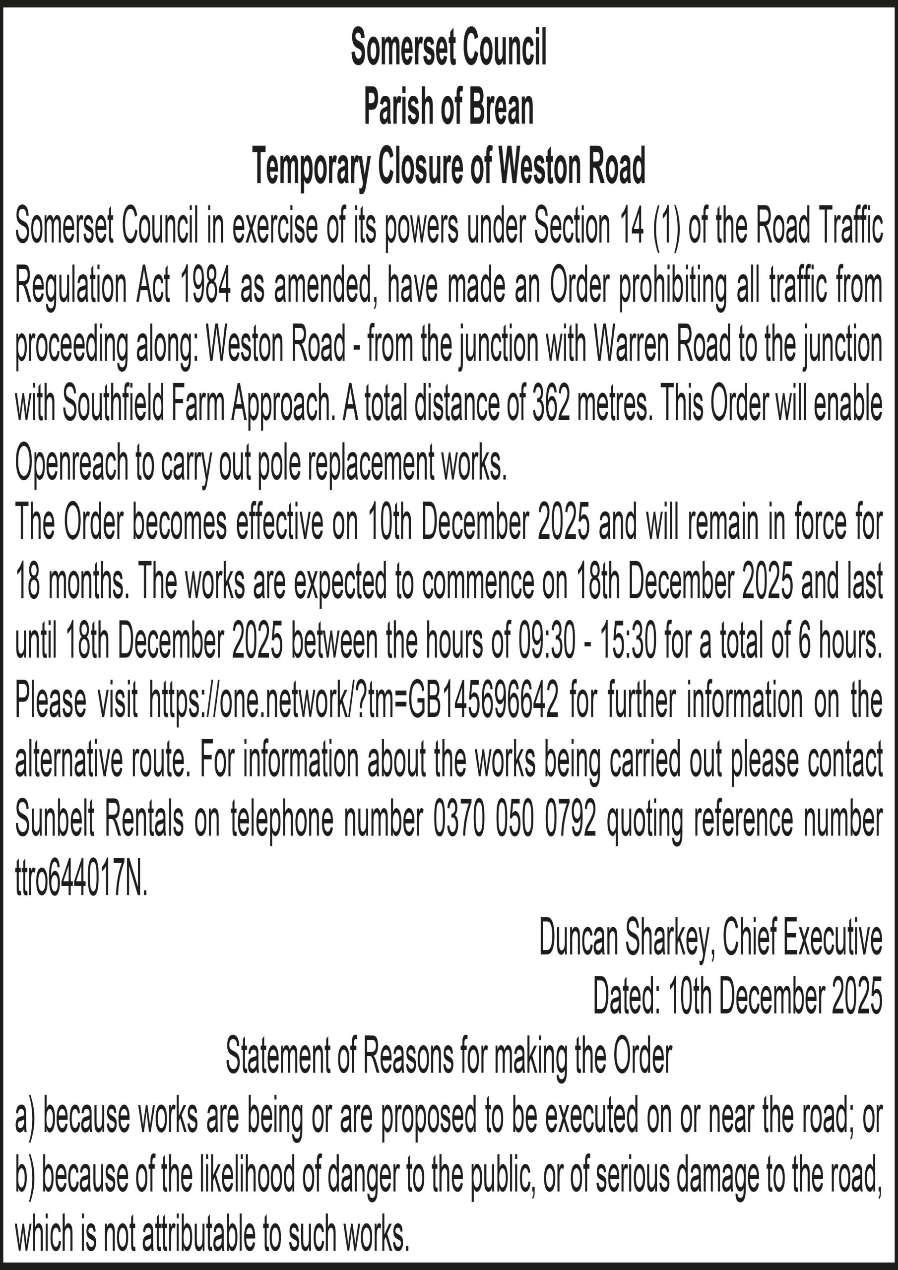 Somerset Council in exercise of its powers under Section 14 (1) of the Road Traffic Regulation Act 1984 as amended, have made an Order prohibiting all traffic from proceeding along: Weston Road – from the junction with Warren Road to the junction with Southfield Farm Approach. A total distance of 362 metres. This Order will enable Openreach to carry out pole replacement works.