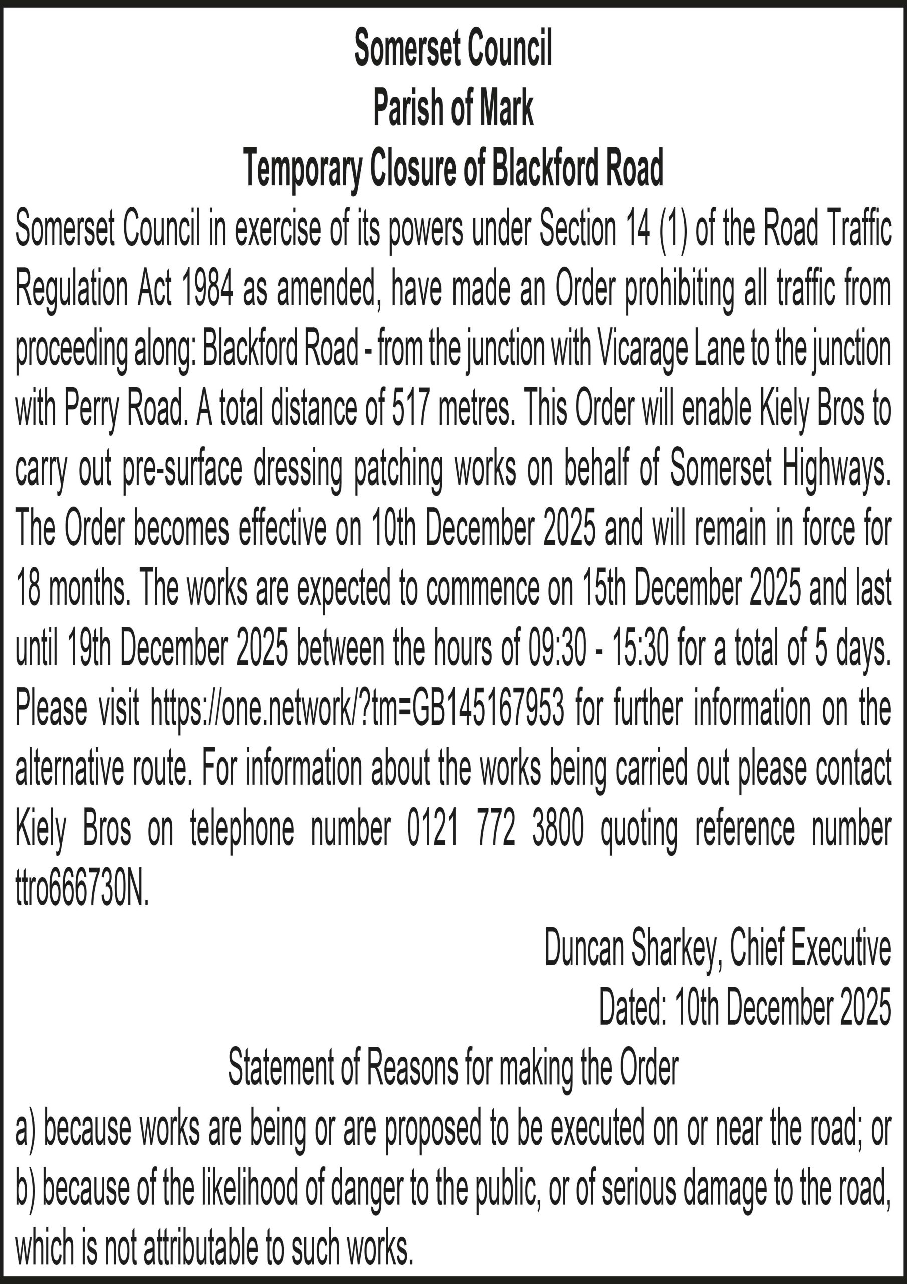 Somerset Council in exercise of its powers under Section 14 (1) of the Road Traffic Regulation Act 1984 as amended, have made an Order prohibiting all traffic from proceeding along: Blackford Road – from the junction with Vicarage Lane to the junction with Perry Road. A total distance of 517 metres. This Order will enable Kiely Bros to carry out pre-surface dressing patching works on behalf of Somerset Highways.