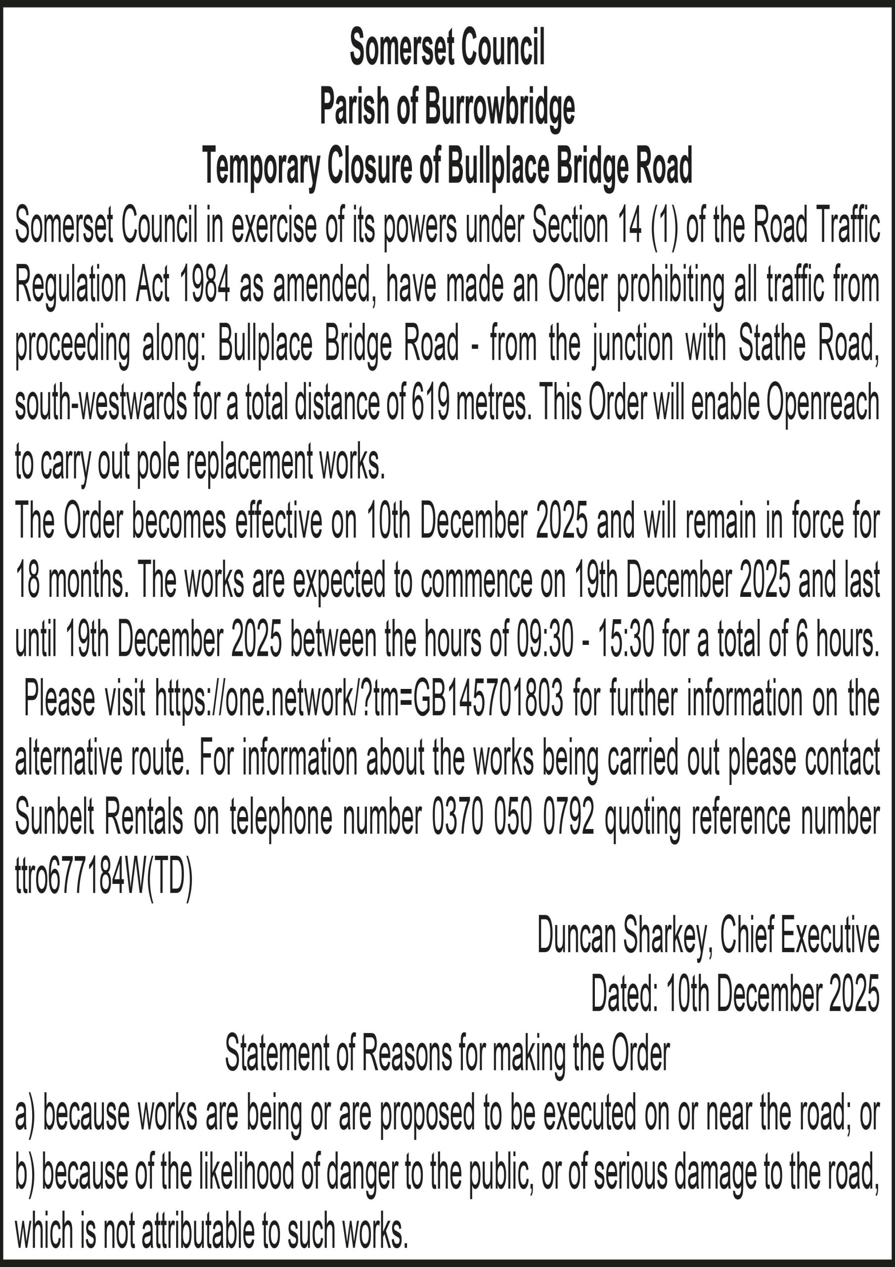 Somerset Council in exercise of its powers under Section 14 (1) of the Road Traffic Regulation Act 1984 as amended, have made an Order prohibiting all traffic from proceeding along: Bullplace Bridge Road – from the junction with Stathe Road, south-westwards for a total distance of 619 metres. This Order will enable Openreach to carry out pole replacement works.