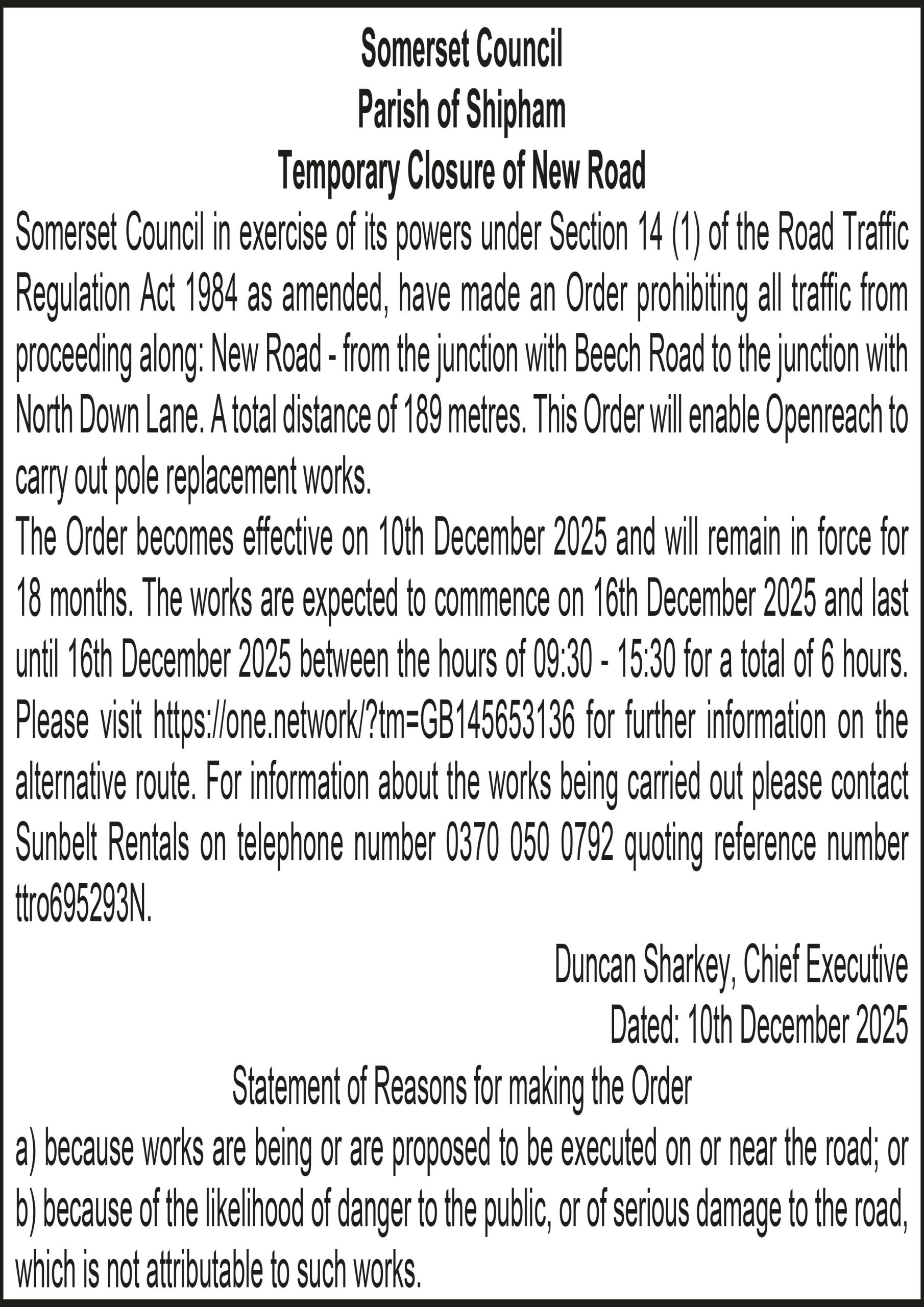 The Order becomes effective on 10th December 2025 and will remain in force for 18 months. The works are expected to commence on 19th December 2025 and last until 19th December 2025 between the hours of 09:30 – 15:30 for a total of 6 hours. Please visit https://one.network/?tm=GB145697186 for further information on the alternative route. For information about the works being carried out please contact Sunbelt Rentals on telephone number 0370 050 0792 quoting reference number ttro874800N