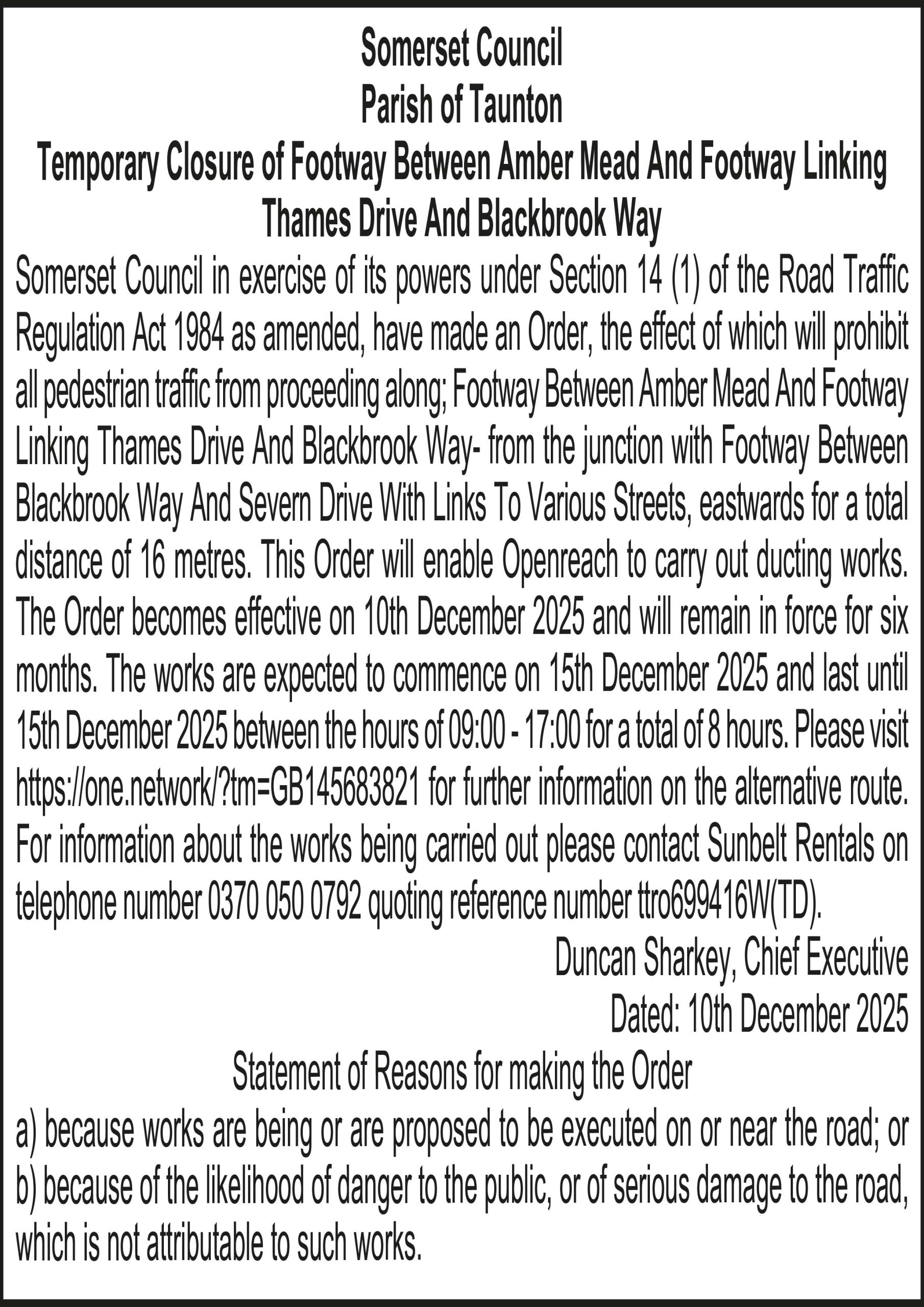 The Order becomes effective on 10th December 2025 and will remain in force for six months. The works are expected to commence on 15th December 2025 and last until 15th December 2025 between the hours of 09:00 – 17:00 for a total of 8 hours. Please visit https://one.network/?tm=GB145683821 for further information on the alternative route. For information about the works being carried out please contact Sunbelt Rentals on telephone number 0370 050 0792 quoting reference number ttro699416W(TD).