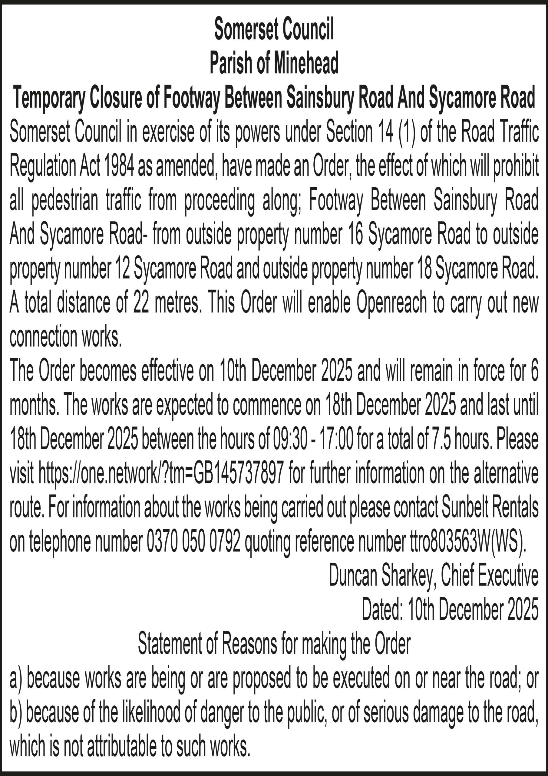 The Order becomes effective on 10th December 2025 and will remain in force for 6 months. The works are expected to commence on 18th December 2025 and last until 18th December 2025 between the hours of 09:30 – 17:00 for a total of 7.5 hours. Please visit https://one.network/?tm=GB145737897 for further information on the alternative route. For information about the works being carried out please contact Sunbelt Rentals on telephone number 0370 050 0792 quoting reference number ttro803563W(WS).