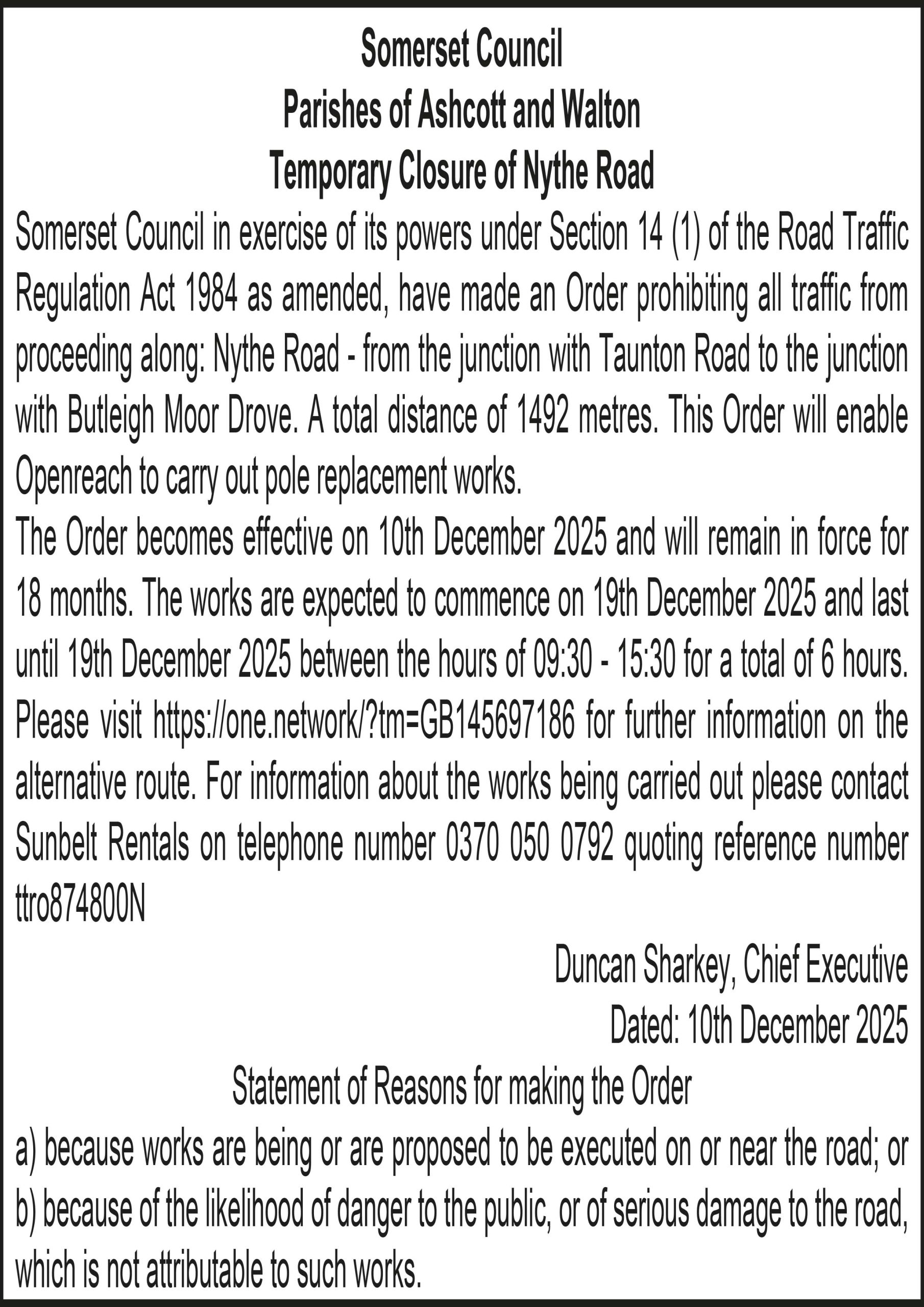 Somerset Council in exercise of its powers under Section 14 (1) of the Road Traffic Regulation Act 1984 as amended, have made an Order prohibiting all traffic from proceeding along: Nythe Road – from the junction with Taunton Road to the junction with Butleigh Moor Drove. A total distance of 1492 metres. This Order will enable Openreach to carry out pole replacement works.