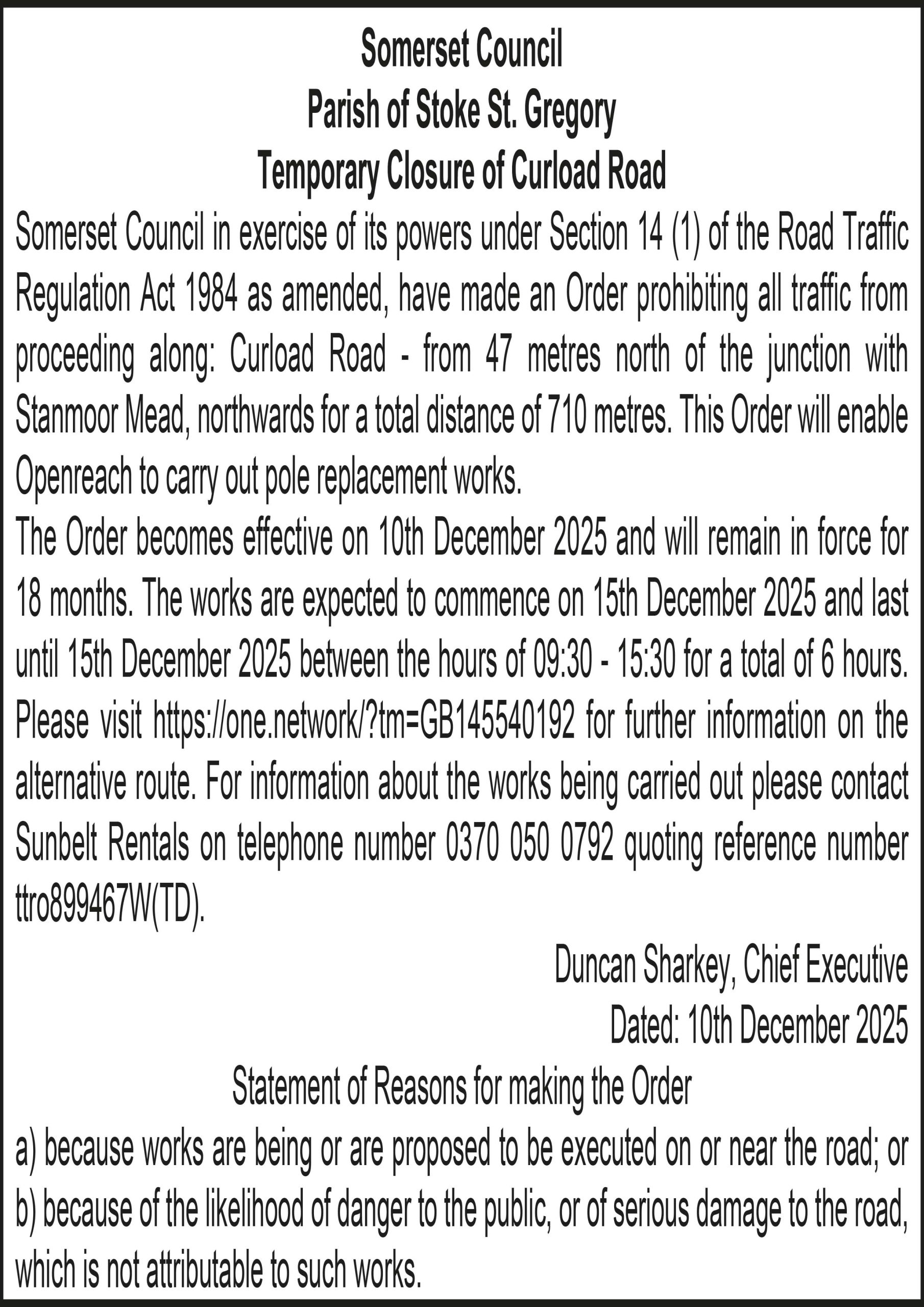 Somerset Council in exercise of its powers under Section 14 (1) of the Road Traffic Regulation Act 1984 as amended, have made an Order prohibiting all traffic from proceeding along: Curload Road – from 47 metres north of the junction with Stanmoor Mead, northwards for a total distance of 710 metres. This Order will enable Openreach to carry out pole replacement works.