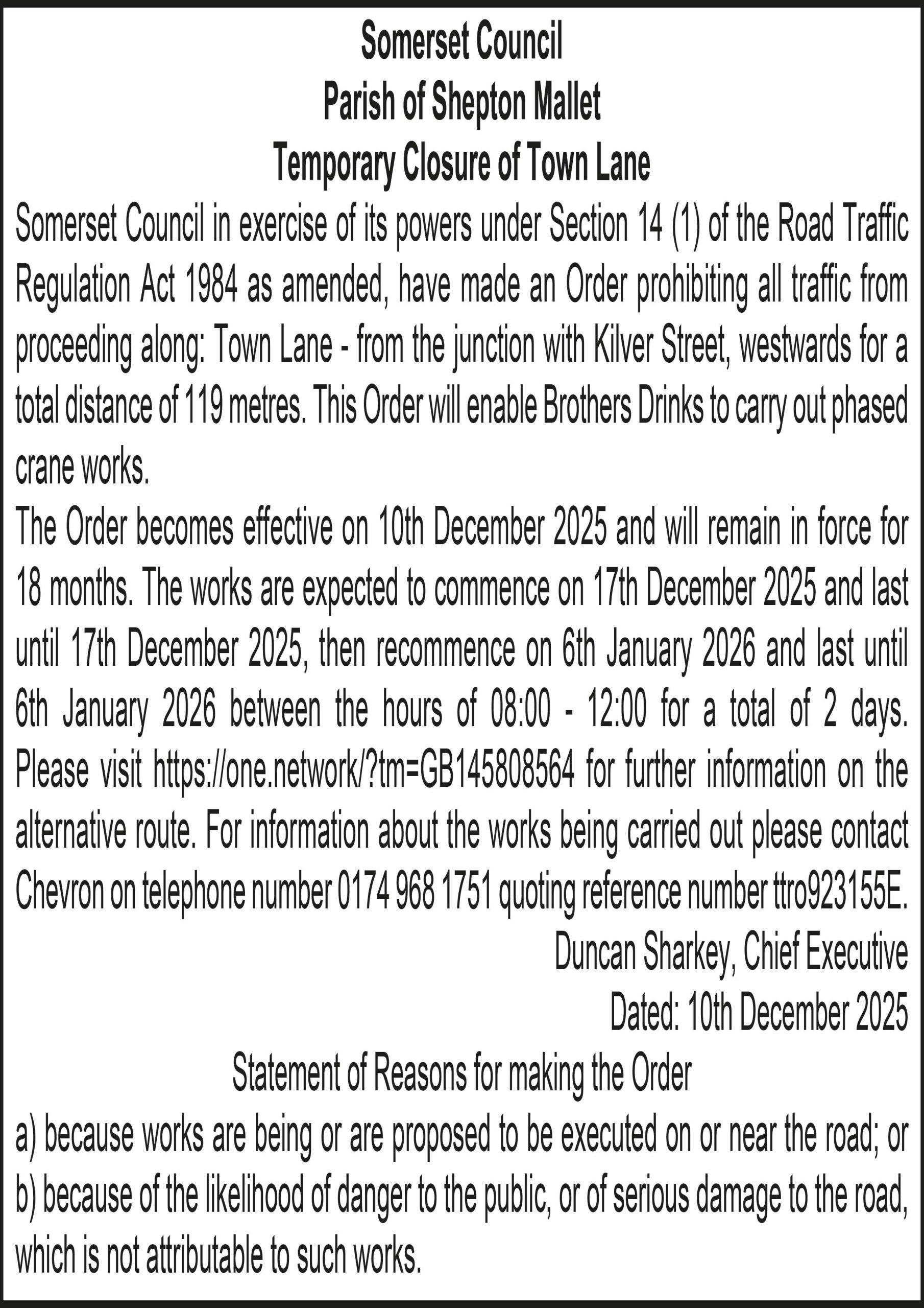 The Order becomes effective on 24th December 2025 and will remain in force for 18 months. The phased works are expected to commence any time after 1st January 2026. The phased works will take place within the stated period. The restrictions will only be in place when necessary and when indicated by traffic signs. The road will be reopened when no works are taking place. Please visit www.one.network/ for further information on the alternative route. The works promoter will contact residents and businesses directly to discuss access arrangements. Advanced warning signs will be installed 10 days prior to the commencement of works for each closure. For information about the works being carried out please contact Somerset Highways on 0300 123 2224 and quote the corresponding TTRO reference number, e.g. ttro751939(TD).