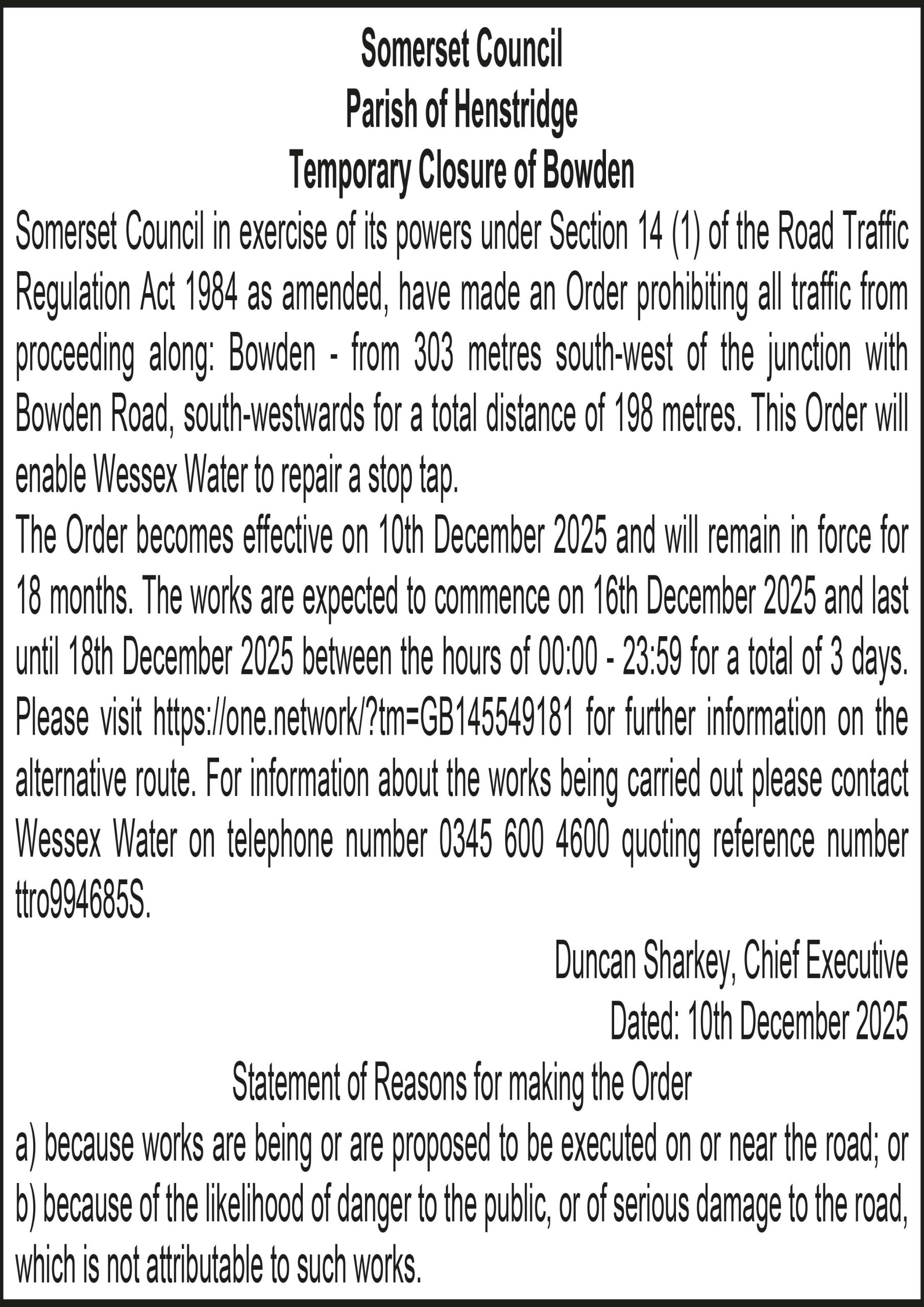 The Order becomes effective on 10th December 2025 and will remain in force for 18 months. The works are expected to commence on 16th December 2025 and last until 16th December 2025 between the hours of 09:30 – 15:30 for a total of 6 hours. Please visit https://one.network/?tm=GB145357794 for further information on the alternative route. For information about the works being carried out please contact Wessex Water on telephone number 0345 600 3600 quoting reference number ttro251489W(TD).