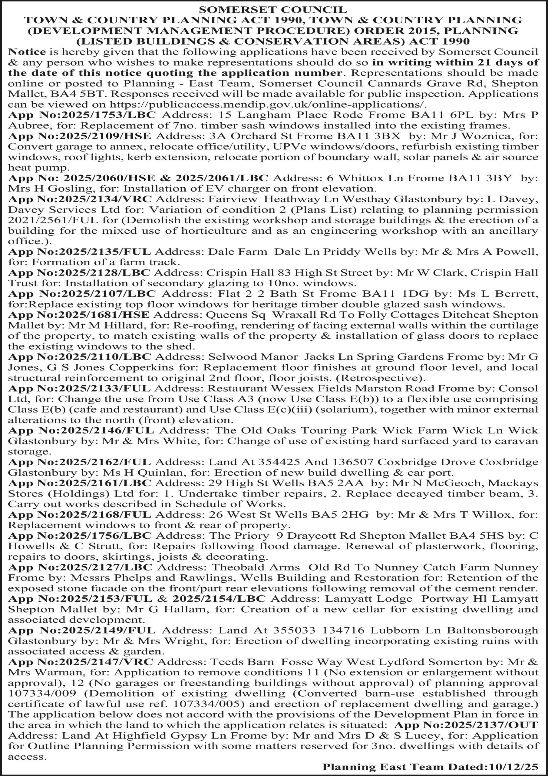 App No:2025/2147/VRC Address: Teeds Barn Fosse Way West Lydford Somerton by: Mr & Mrs Warman, for: Application to remove conditions 11 (No extension or enlargement without approval), 12 (No garages or freestanding buildings without approval) of planning approval 107334/009 (Demolition of existing dwelling (Converted barn-use established through certificate of lawful use ref. 107334/005) and erection of replacement dwelling and garage.) The application below does not accord with the provisions of the Development Plan in force in the area in which the land to which the application relates is situated: App No:2025/2137/OUT Address: Land At Highfield Gypsy Ln Frome by: Mr and Mrs D & S Lucey, for: Application for Outline Planning Permission with some matters reserved for 3no. dwellings with details of access.