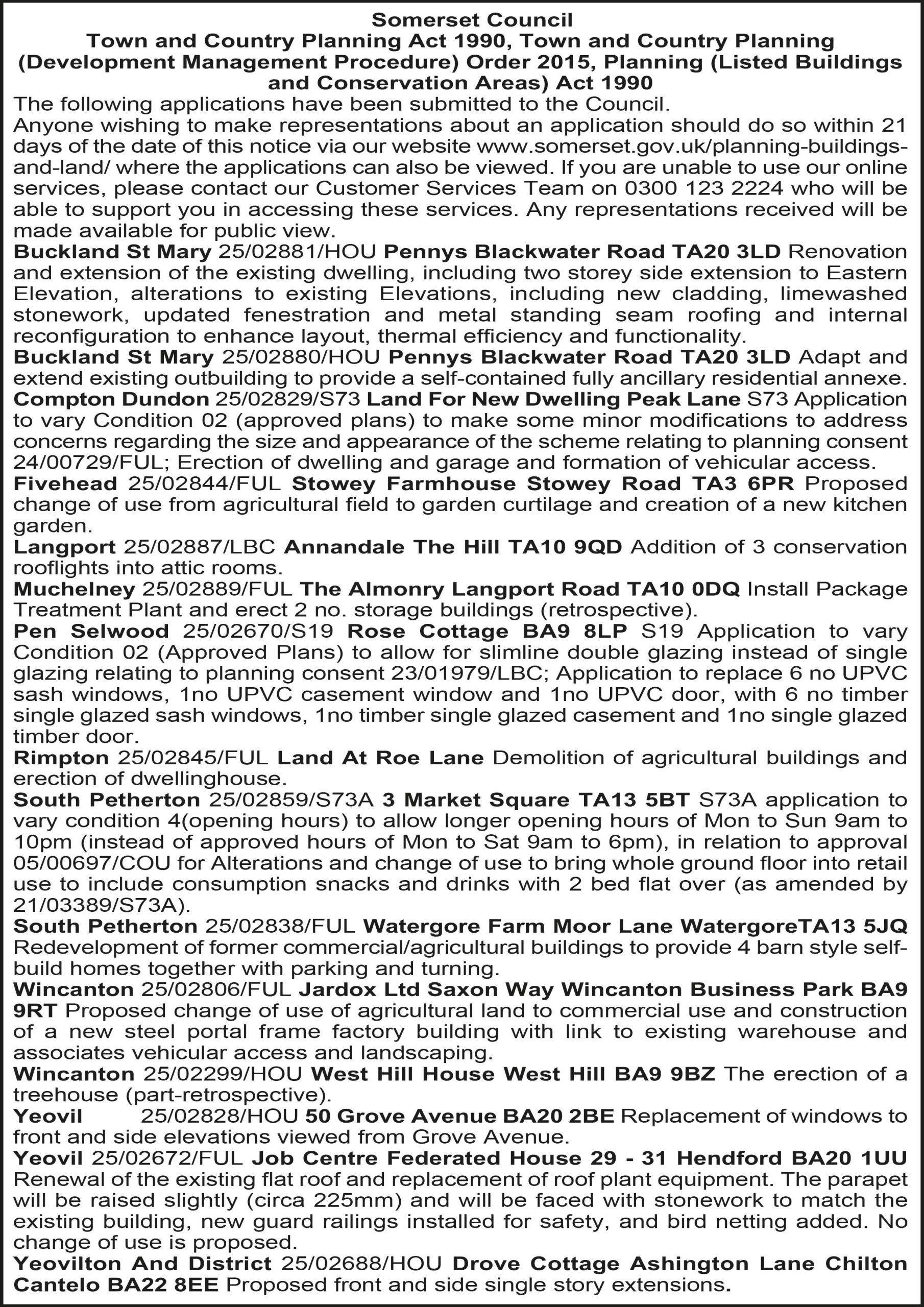 Notice is hereby given that the following applications have been received: Application No. 04/25/00006: 2 Eastside Lane, Bawdrip, Bridgwater, TA7 8QB. Installation of 11 photovoltaic (PV) panels on a single storey east-west facing pitched roof at the rear of the property. This application may affect the setting of a listed building & the setting of a public right of way. Application No. 10/25/00007: Willow Barn, Oggshole Farm Lane, Broomfield, Bridgwater, TA5 2EJ. Conversion of existing garage block into holiday let. This development may affect the setting of a public right of way. Application No. 34/25/00011: 11 Main Road, Middlezoy, Bridgwater, TA7 0PB. Conversion of outbuilding to annexe, including single storey extension to the East elevation. This application may affect the setting of a listed building. (Householder application). Application No. 44/25/00019: The Nook, North Down Lane, Shipham, Winscombe, BS25 1SN. Outline application with some matters reserved, for the erection of 5No. dwellings following demolition of existing bungalow, requesting consideration of access. This development may affect the setting of a public right of way. Application No. 17/25/00037: Land To The West Of, Draycott Road, Cheddar. Outline application with some matters reserved except access, for the erection of up to 70 dwellings, public open space, drainage & ancillary works. The proposed development does not accord with the provisions of the development plan in force in the area in which the application site is situated, & this proposal is a major development. Application No. 17/25/00082: Land South of, Bradley Cross Lane, Bradley Cross, Cheddar, BS27. Change of use of land to dog walking area, with erection of boundary fence & parking area. This proposal is a major development, may affect the setting of a public right of way & may affect the setting of a listed building. Application No. 11/25/00105: 20 College Street, Burnham On Sea,TA8 1AS. Erection of 1No. internally illuminated fascia sign, 2No. wall mounted fabric drop banners, & front bollard style wind screen with etched effect vinyl graphics. This development is on a site adjoining a Conservation Area & may affect its character. Application No. 08/25/00183: Land Between Friarn Street And, Broadway, Bridgwater. Creation of 4No. parking spaces, erection of refuse store, & conversion of previously approved internal bin store to form 1No. 1-bedroom apartment. This site lies within a Conservation Area & may affect the setting of a listed building. Application No. 08/25/00189: Angel Place Shopping Centre, High Street, Bridgwater. TA6 3TQ. Change of Use of North element of Angel Place Shopping Centre to create 4No. smaller units from existing Unit 9, including access onto Mount Street and access to service facilities. This application affects the setting of a listed building, and may affect the character of a Conservation Area. For applications identified as householder, if an appeal against a refusal of planning permission is submitted, there will be no further opportunity to comment at the appeal stage. Comments welcome by 31/12/2025.