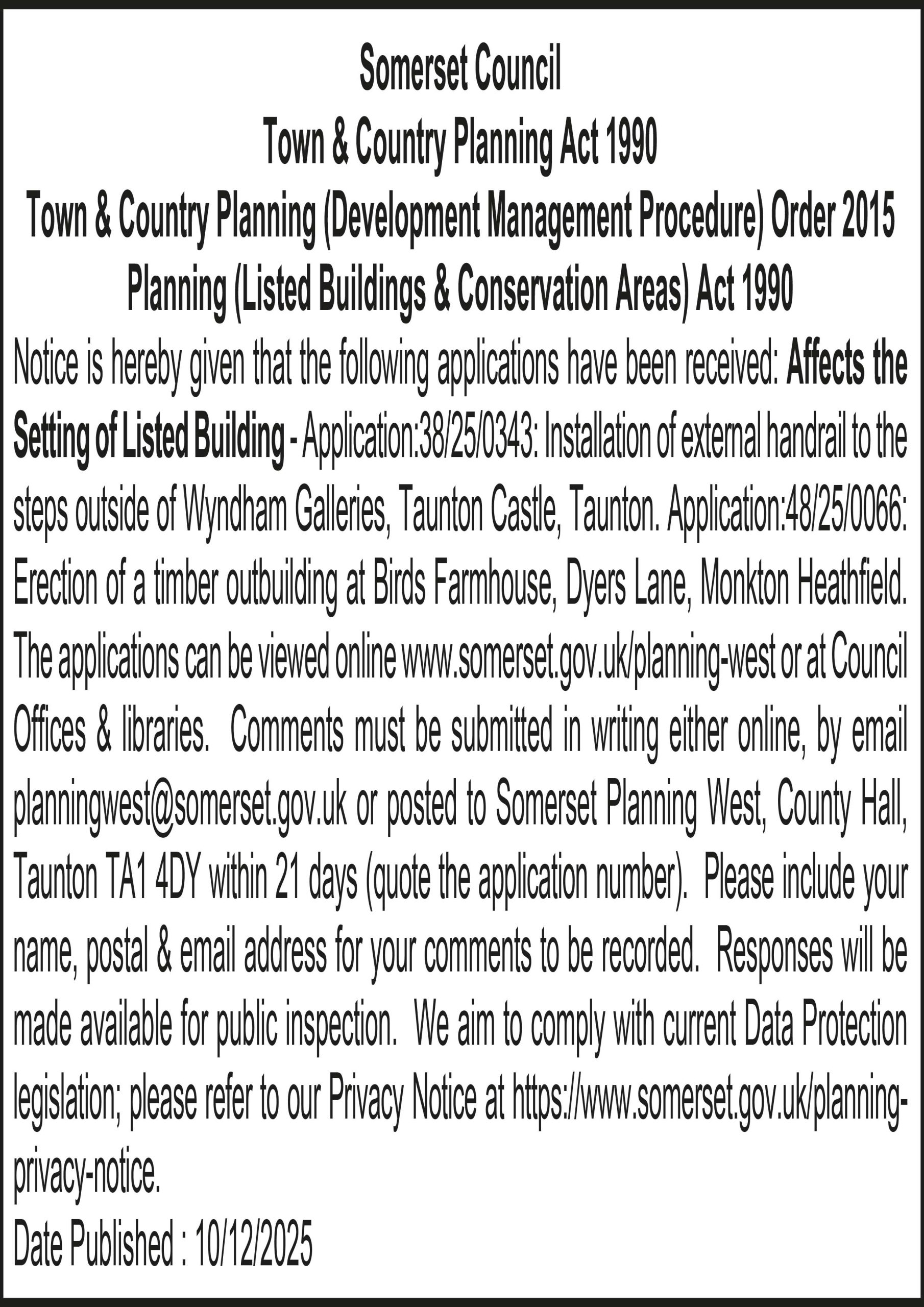 Notice is hereby given that the following applications have been received: Affects the Setting of Listed Building – Application:38/25/0343: Installation of external handrail to the steps outside of Wyndham Galleries, Taunton Castle, Taunton. Application:48/25/0066: Erection of a timber outbuilding at Birds Farmhouse, Dyers Lane, Monkton Heathfield.