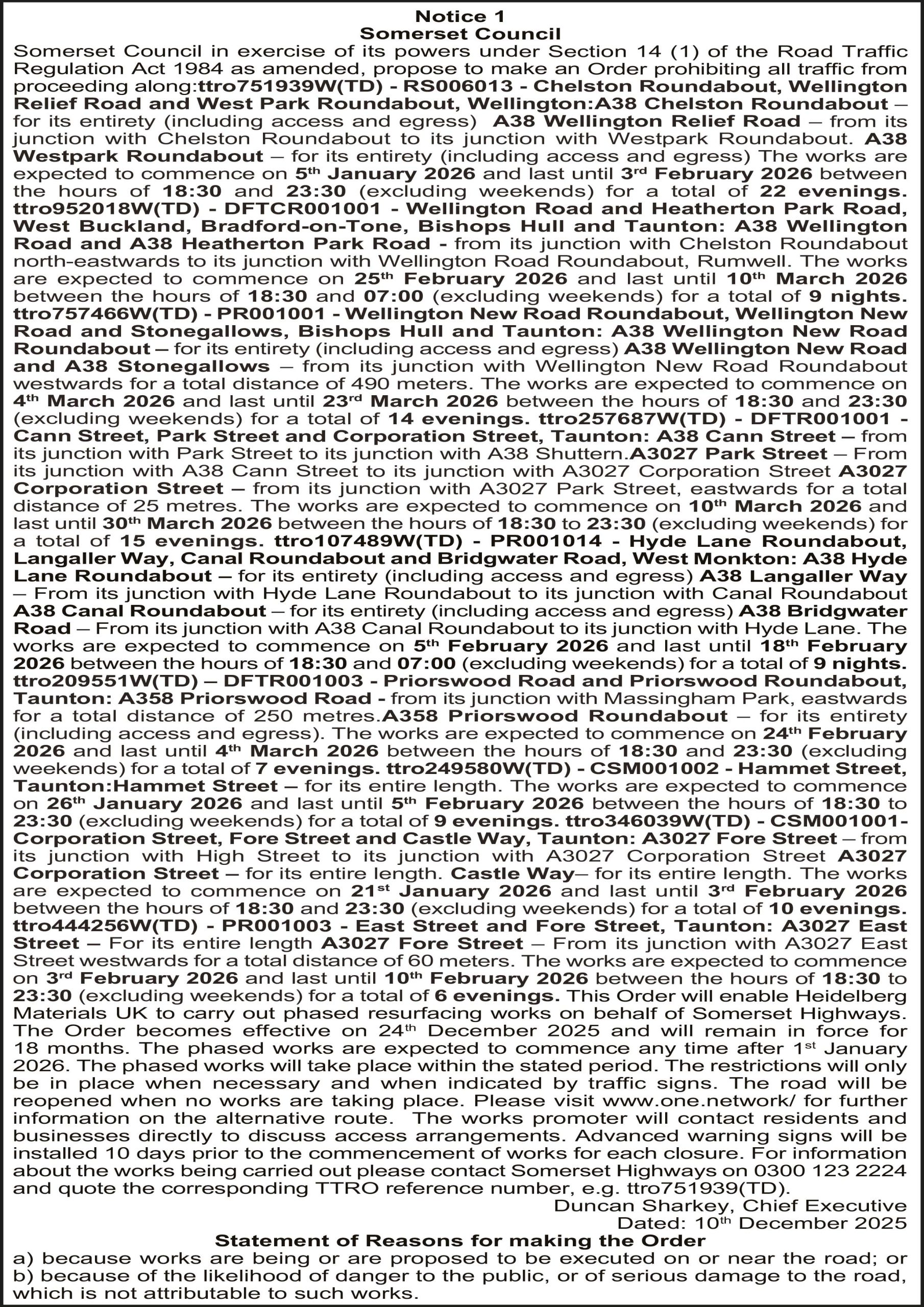 ttro952018W(TD) – DFTCR001001 – Wellington Road and Heatherton Park Road, West Buckland, Bradford-on-Tone, Bishops Hull and Taunton: A38 Wellington Road and A38 Heatherton Park Road – from its junction with Chelston Roundabout north-eastwards to its junction with Wellington Road Roundabout, Rumwell. The works are expected to commence on 25th February 2026 and last until 10th March 2026 between the hours of 18:30 and 07:00 (excluding weekends) for a total of 9 nights. ttro757466W(TD) – PR001001 – Wellington New Road Roundabout, Wellington New Road and Stonegallows, Bishops Hull and Taunton: A38 Wellington New Road Roundabout – for its entirety (including access and egress) A38 Wellington New Road and A38 Stonegallows – from its junction with Wellington New Road Roundabout westwards for a total distance of 490 meters. The works are expected to commence on 4th March 2026 and last until 23rd March 2026 between the hours of 18:30 and 23:30 (excluding weekends) for a total of 14 evenings. ttro257687W(TD) – DFTR001001 – Cann Street, Park Street and Corporation Street, Taunton: A38 Cann Street – from its junction with Park Street to its junction with A38 Shuttern. A3027 Park Street – From its junction with A38 Cann Street to its junction with A3027 Corporation Street A3027 Corporation Street – from its junction with A3027 Park Street, eastwards for a total distance of 25 metres. The works are expected to commence on 10th March 2026 and last until 30th March 2026 between the hours of 18:30 to 23:30 (excluding weekends) for a total of 15 evenings. ttro107489W(TD) – PR001014 – Hyde Lane Roundabout, Langaller Way, Canal Roundabout and Bridgwater Road, West Monkton: A38 Hyde Lane Roundabout – for its entirety (including access and egress) A38 Langaller Way – From its junction with Hyde Lane Roundabout to its junction with Canal Roundabout A38 Canal Roundabout – for its entirety (including access and egress) A38 Bridgwater Road – From its junction with A38 Canal Roundabout to its junction with Hyde Lane. The works are expected to commence on 5th February 2026 and last until 18th February 2026 between the hours of 18:30 and 07:00 (excluding weekends) for a total of 9 nights. ttro209551W(TD) – DFTR001003 – Priorswood Road and Priorswood Roundabout, Taunton: A358 Priorswood Road – from its junction with Massingham Park, eastwards for a total distance of 250 metres. A358 Priorswood Roundabout – for its entirety (including access and egress). The works are expected to commence on 24th February 2026 and last until 4th March 2026 between the hours of 18:30 and 23:30 (excluding weekends) for a total of 7 evenings. ttro249580W(TD) – CSM001002 – Hammet Street, Taunton:Hammet Street – for its entire length. The works are expected to commence on 26th January 2026 and last until 5th February 2026 between the hours of 18:30 to 23:30 (excluding weekends) for a total of 9 evenings. ttro346039W(TD) – CSM001001 – Corporation Street, Fore Street and Castle Way, Taunton: A3027 Fore Street – from its junction with High Street to its junction with A3027 Corporation Street A3027 Corporation Street – for its entire length. Castle Way– for its entire length. The works are expected to commence on 21st January 2026 and last until 3rd February 2026 between the hours of 18:30 and 23:30 (excluding weekends) for a total of 10 evenings. ttro444256W(TD) – PR001003 – East Street and Fore Street, Taunton: A3027 East Street – For its entire length A3027 Fore Street – From its junction with A3027 East Street westwards for a total distance of 60 meters. The works are expected to commence on 3rd February 2026 and last until 10th February 2026 between the hours of 18:30 to 23:30 (excluding weekends) for a total of 6 evenings. This Order will enable Heidelberg Materials UK to carry out phased resurfacing works on behalf of Somerset Highways.