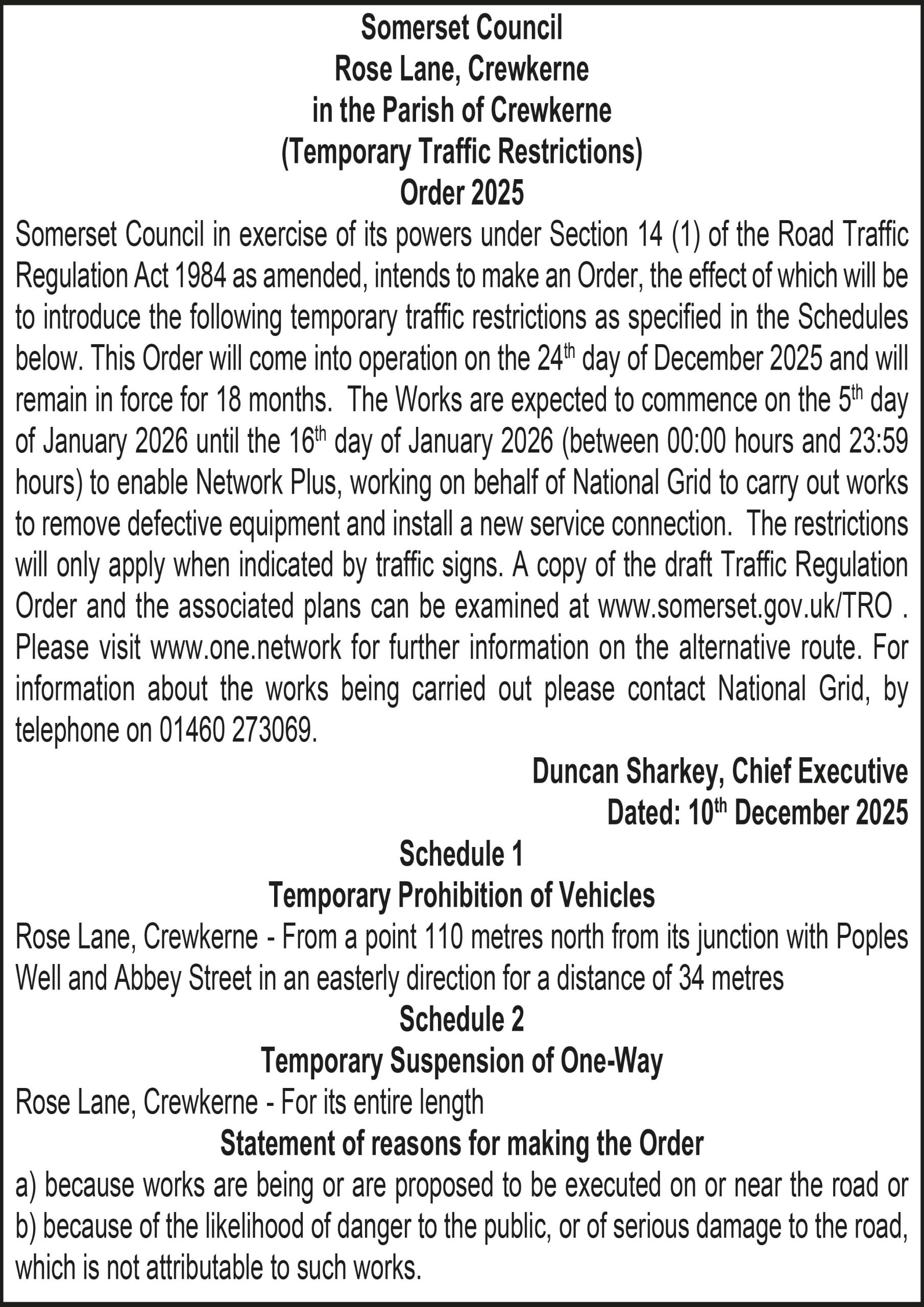 Somerset Council in exercise of its powers under Section 14 (1) of the Road Traffic Regulation Act 1984 as amended, intends to make an Order, the effect of which will be to introduce the following temporary traffic restrictions as specified in the Schedules below. This Order will come into operation on the 24th day of December 2025 and will remain in force for 18 months. The Works are expected to commence on the 5th day of January 2026 until the 16th day of January 2026 (between 00:00 hours and 23:59 hours) to enable Network Plus, working on behalf of National Grid to carry out works to remove defective equipment and install a new service connection. The restrictions will only apply when indicated by traffic signs. A copy of the draft Traffic Regulation Order and the associated plans can be examined at www.somerset.gov.uk/TRO.