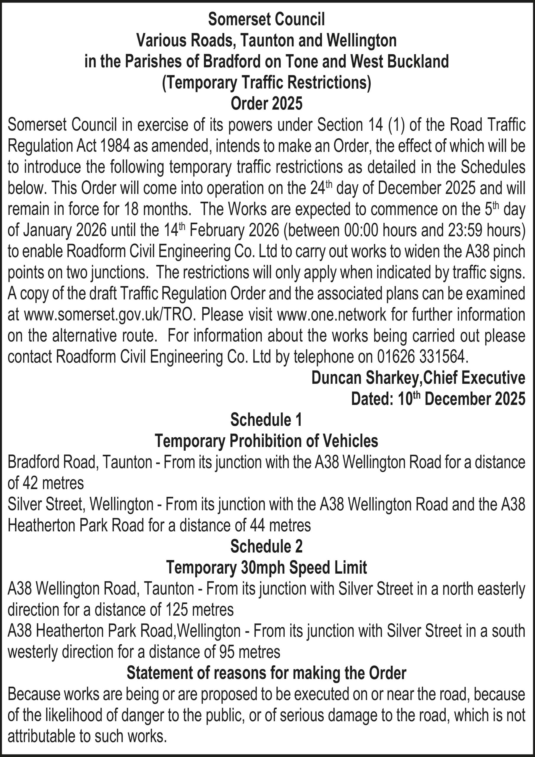 Somerset Council in exercise of its powers under Section 14 (1) of the Road Traffic Regulation Act 1984 as amended, intends to make an Order, the effect of which will be to introduce the following temporary traffic restrictions as detailed in the Schedules below. This Order will come into operation on the 24th day of December 2025 and will remain in force for 18 months. The Works are expected to commence on the 5th day of January 2026 until the 14th February 2026 (between 00:00 hours and 23:59 hours) to enable Roadform Civil Engineering Co. Ltd to carry out works to widen the A38 pinch points on two junctions. The restrictions will only apply when indicated by traffic signs. A copy of the draft Traffic Regulation Order and the associated plans can be examined at www.somerset.gov.uk/TRO. Please visit www.one.network for further information on the alternative route. For information about the works being carried out please contact Roadform Civil Engineering Co. Ltd by telephone on 01626 331564.