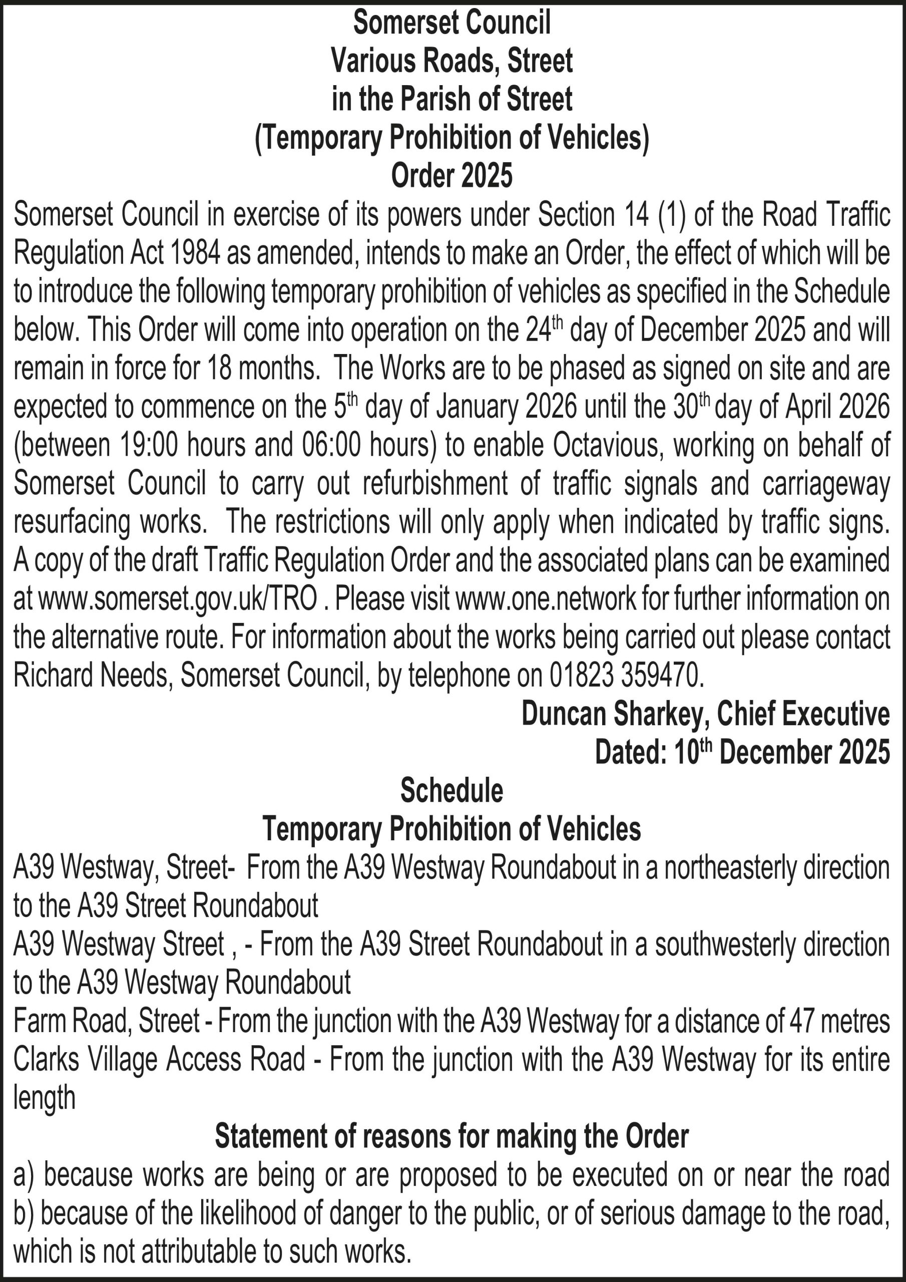Somerset Council in exercise of its powers under Section 14 (1) of the Road Traffic Regulation Act 1984 as amended, intends to make an Order, the effect of which will be to introduce the following temporary prohibition of vehicles as specified in the Schedule below. This Order will come into operation on the 24th day of December 2025 and will remain in force for 18 months. The Works are to be phased as signed on site and are expected to commence on the 5th day of January 2026 until the 30th day of April 2026 (between 19:00 hours and 06:00 hours) to enable Octavious, working on behalf of Somerset Council to carry out refurbishment of traffic signals and carriageway resurfacing works. The restrictions will only apply when indicated by traffic signs. A copy of the draft Traffic Regulation Order and the associated plans can be examined at www.somerset.gov.uk/TRO. Please visit www.one.network for further information on the alternative route. For information about the works being carried out please contact Richard Needs, Somerset Council, by telephone on 01823 359470.
