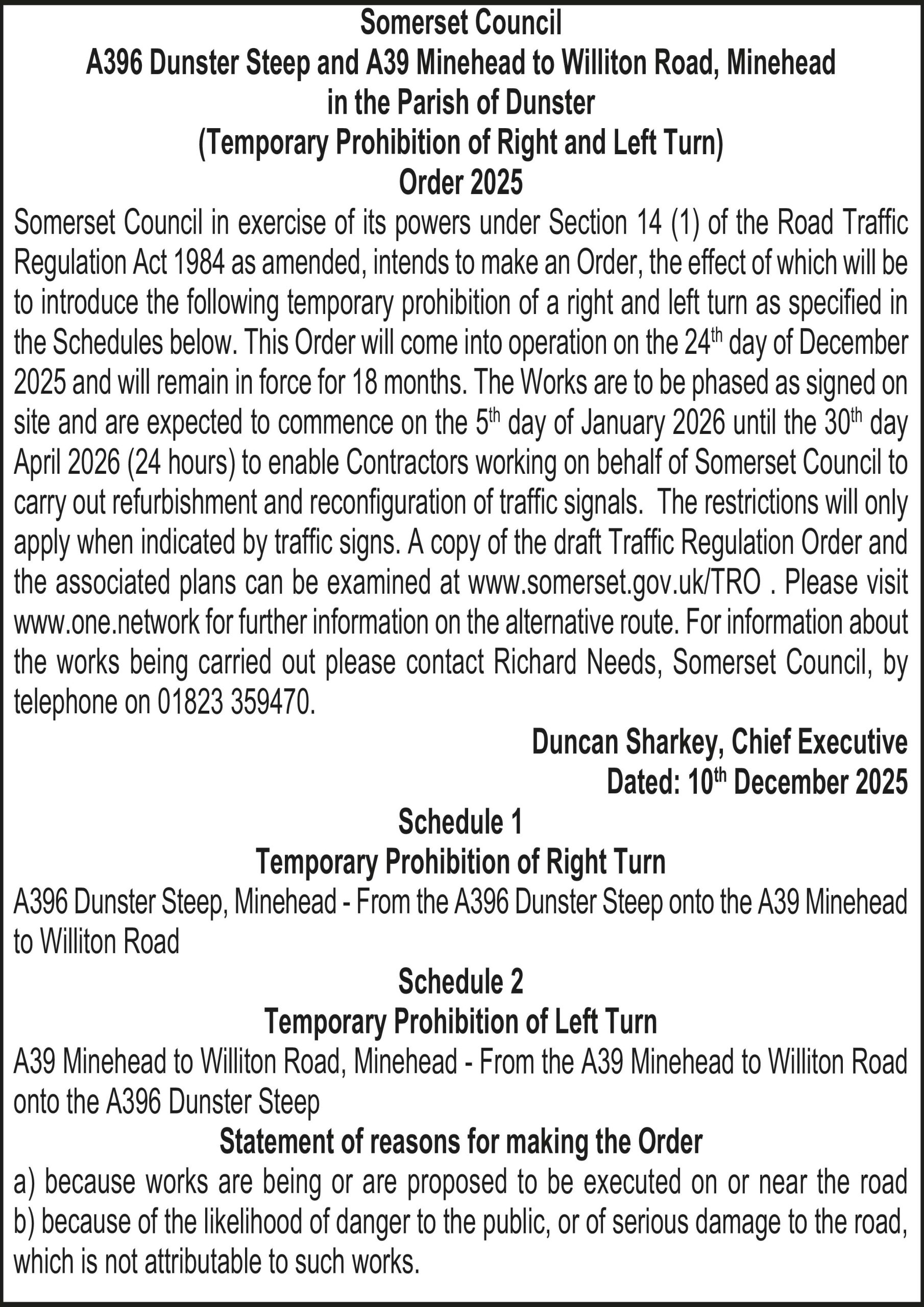 Somerset Council in exercise of its powers under Section 14 (1) of the Road Traffic Regulation Act 1984 as amended, intends to make an Order, the effect of which will be to introduce the following temporary prohibition of a right and left turn as specified in the Schedules below. This Order will come into operation on the 24th day of December 2025 and will remain in force for 18 months. The Works are to be phased as signed on site and are expected to commence on the 5th day of January 2026 until the 30th day April 2026 (24 hours) to enable Contractors working on behalf of Somerset Council to carry out refurbishment and reconfiguration of traffic signals. The restrictions will only apply when indicated by traffic signs. A copy of the draft Traffic Regulation Order and the associated plans can be examined at www.somerset.gov.uk/TRO . Please visit www.one.network for further information on the alternative route. For information about the works being carried out please contact Richard Needs, Somerset Council, by telephone on 01823 359470.