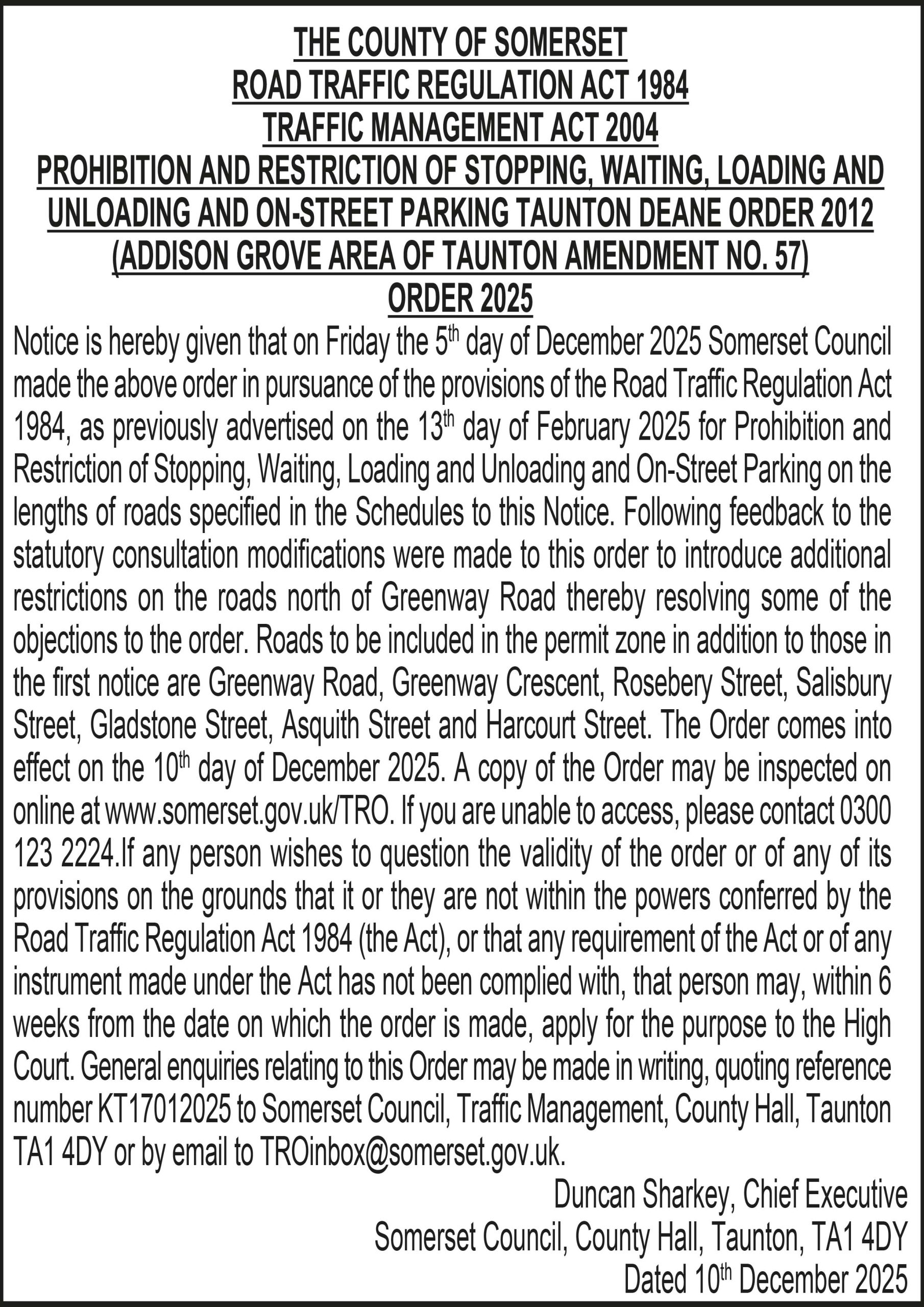 Notice is hereby given that on Friday the 5th day of December 2025 Somerset Council made the above order in pursuance of the provisions of the Road Traffic Regulation Act 1984, as previously advertised on the 13th day of February 2025 for Prohibition and Restriction of Stopping, Waiting, Loading and Unloading and On-Street Parking on the lengths of roads specified in the Schedules to this Notice. Following feedback to the statutory consultation modifications were made to this order to introduce additional restrictions on the roads north of Greenway Road thereby resolving some of the objections to the order. Roads to be included in the permit zone in addition to those in the first notice are Greenway Road, Greenway Crescent, Rosebery Street, Salisbury Street, Gladstone Street, Asquith Street and Harcourt Street. The Order comes into effect on the 10th day of December 2025. A copy of the Order may be inspected on online at www.somerset.gov.uk/TRO. If you are unable to access, please contact 0300 123 2224. If any person wishes to question the validity of the order or of any of its provisions on the grounds that it or they are not within the powers conferred by the Road Traffic Regulation Act 1984 (the Act), or that any requirement of the Act or of any instrument made under the Act has not been complied with, that person may, within 6 weeks from the date on which the order is made, apply for the purpose to the High Court. General enquiries relating to this Order may be made in writing, quoting reference number KT17012025 to Somerset Council, Traffic Management, County Hall, Taunton TA1 4DY or by email to TROinbox@somerset.gov.uk.