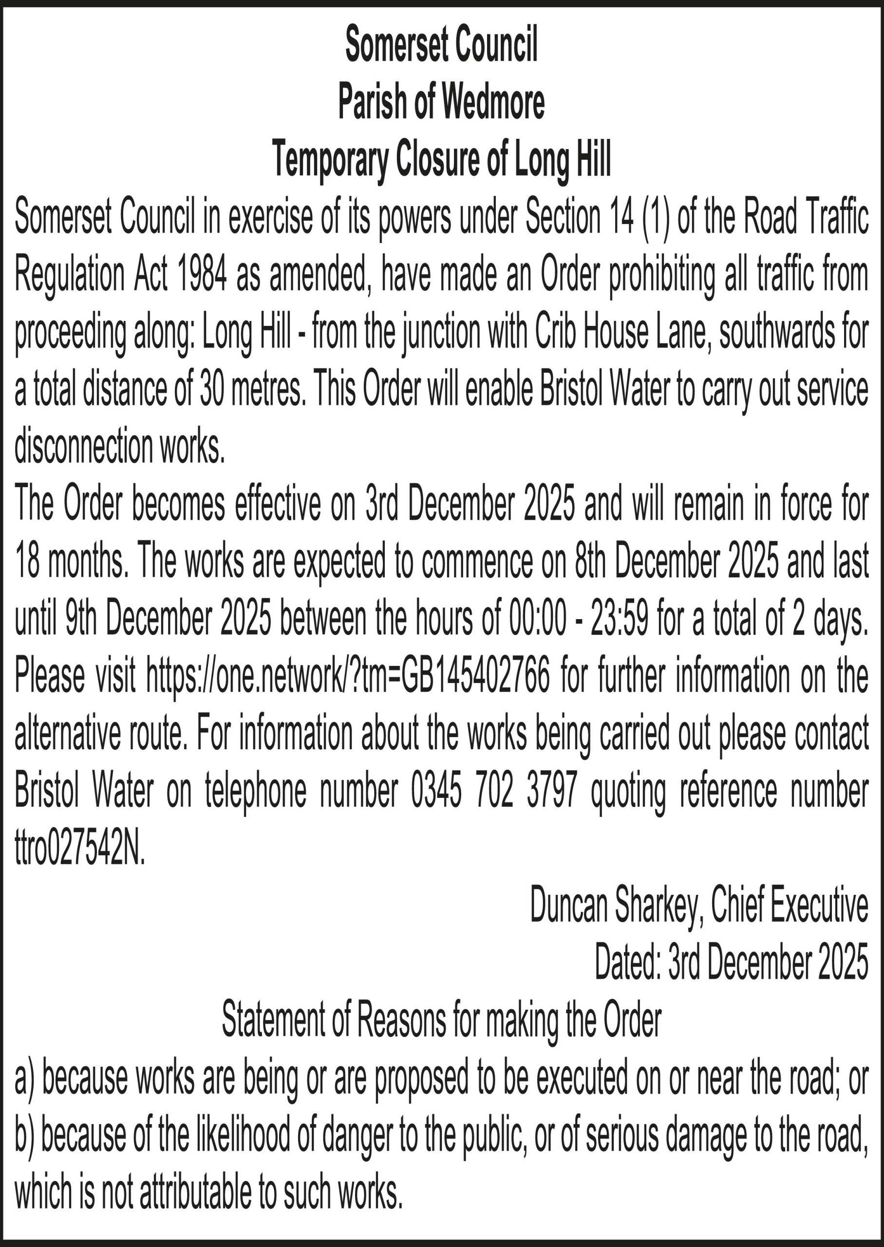 Somerset Council in exercise of its powers under Section 14 (1) of the Road Traffic Regulation Act 1984 as amended, have made an Order prohibiting all traffic from proceeding along: Long Hill – from the junction with Crib House Lane, southwards for a total distance of 30 metres. This Order will enable Bristol Water to carry out service disconnection works.