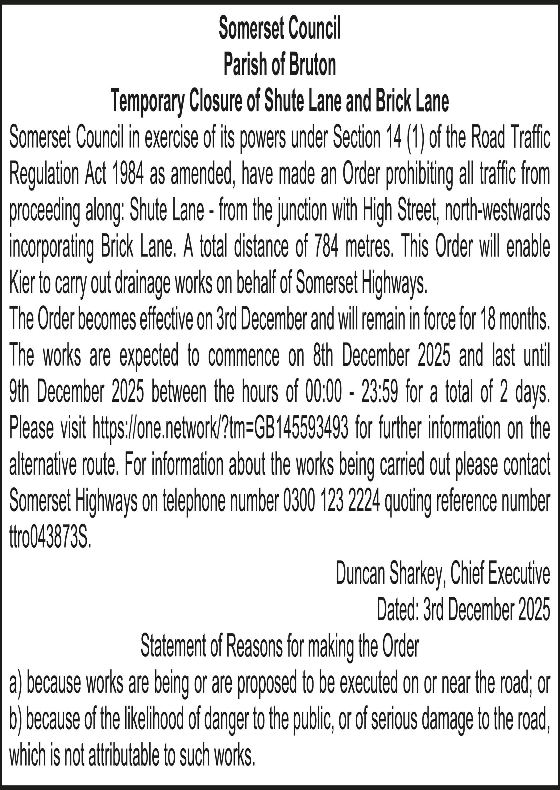 The Order becomes effective on 3rd December and will remain in force for 18 months. The works are expected to commence on 8th December 2025 and last until 9th December 2025 between the hours of 00:00 – 23:59 for a total of 2 days. Please visit https://one.network/?tm=GB145593493 for further information on the alternative route. For information about the works being carried out please contact Somerset Highways on telephone number 0300 123 2224 quoting reference number ttro043873S.