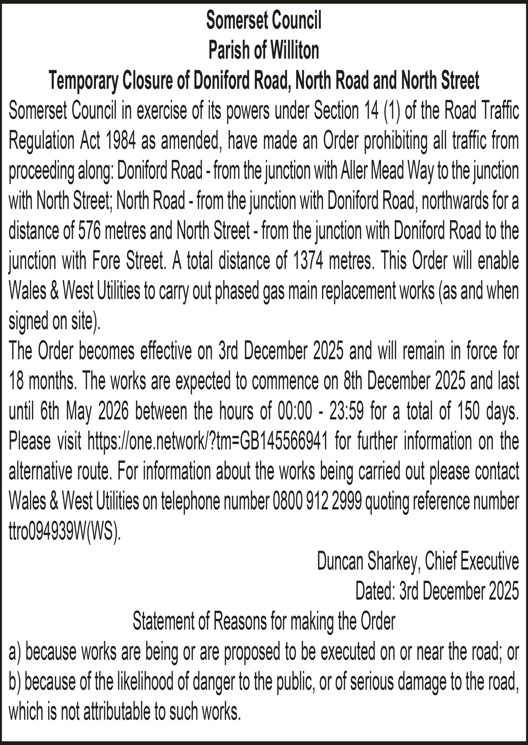 Somerset Council in exercise of its powers under Section 14 (1) of the Road Traffic Regulation Act 1984 as amended, have made an Order prohibiting all traffic from proceeding along: Doniford Road – from the junction with Aller Mead Way to the junction with North Street; North Road – from the junction with Doniford Road, northwards for a distance of 576 metres and North Street – from the junction with Doniford Road to the junction with Fore Street. A total distance of 1374 metres. This Order will enable Wales & West Utilities to carry out phased gas main replacement works (as and when signed on site).