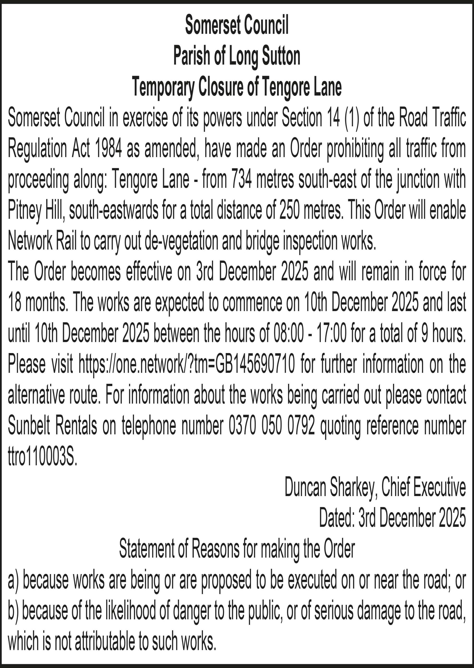 Somerset Council in exercise of its powers under Section 14 (1) of the Road Traffic Regulation Act 1984 as amended, have made an Order prohibiting all traffic from proceeding along: Tengore Lane – from 734 metres south-east of the junction with Pitney Hill, south-eastwards for a total distance of 250 metres. This Order will enable Network Rail to carry out de-vegetation and bridge inspection works.