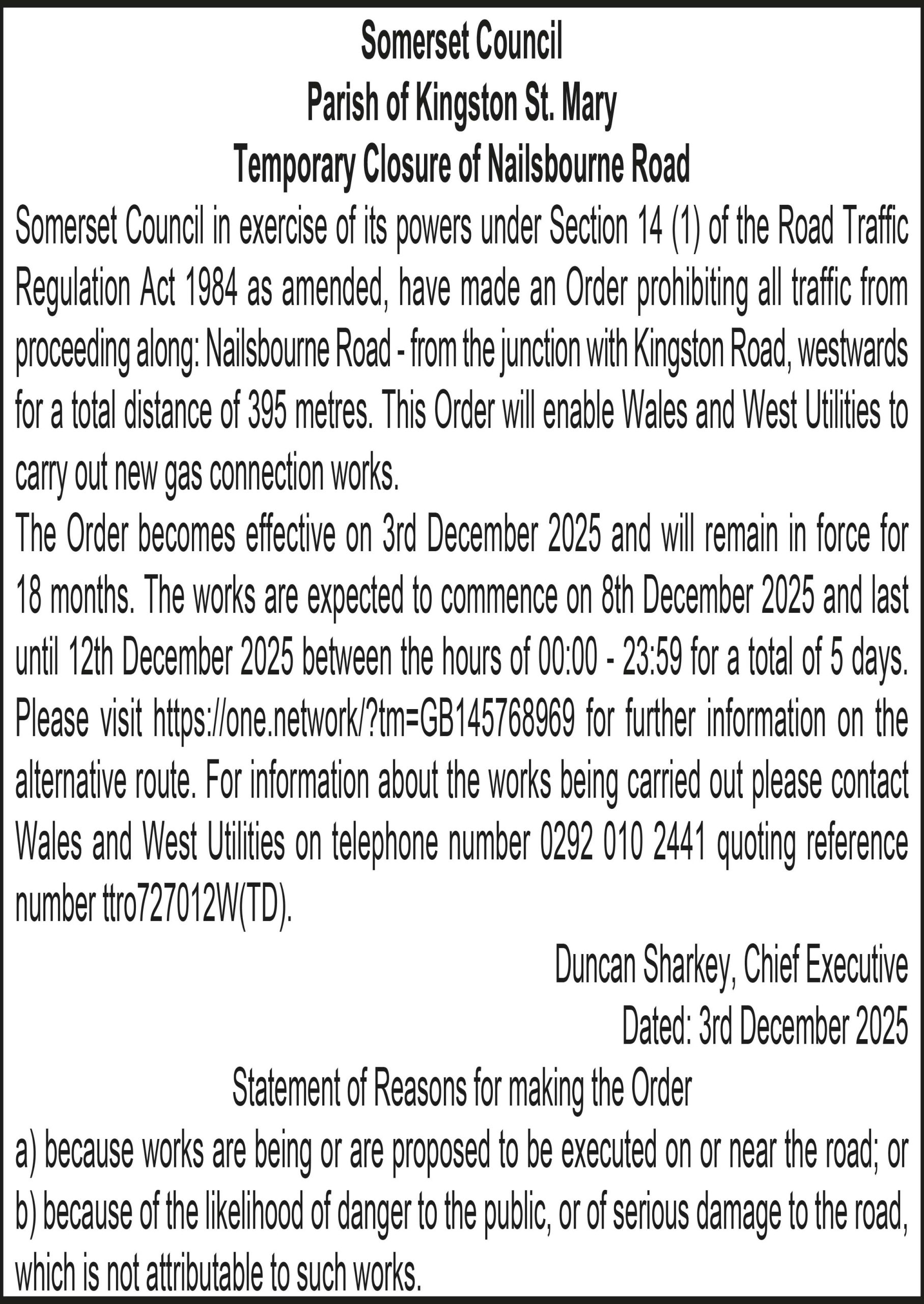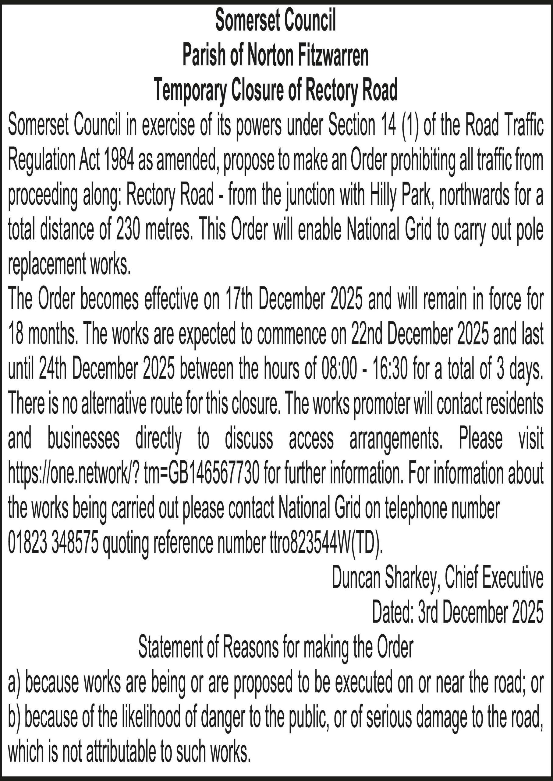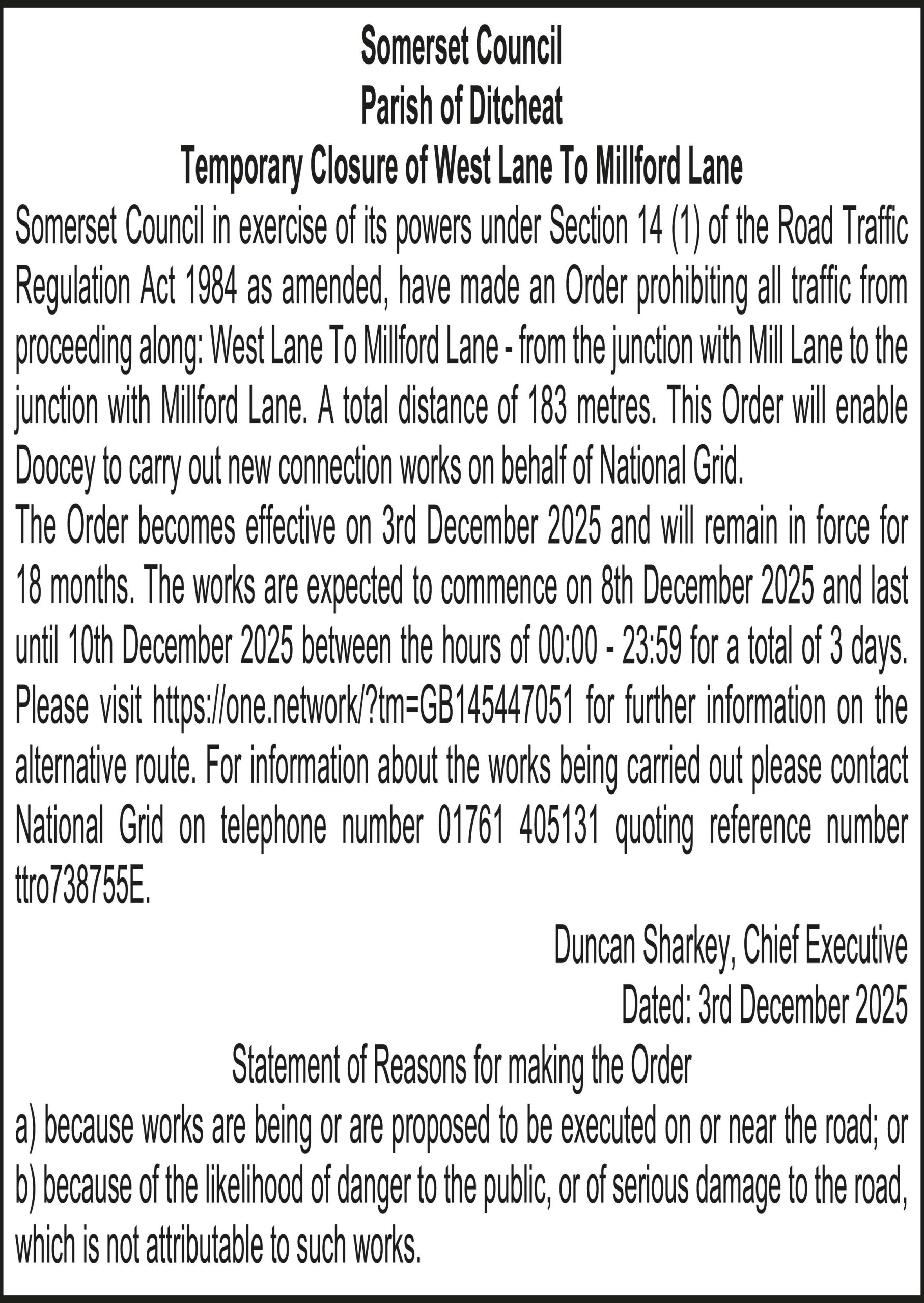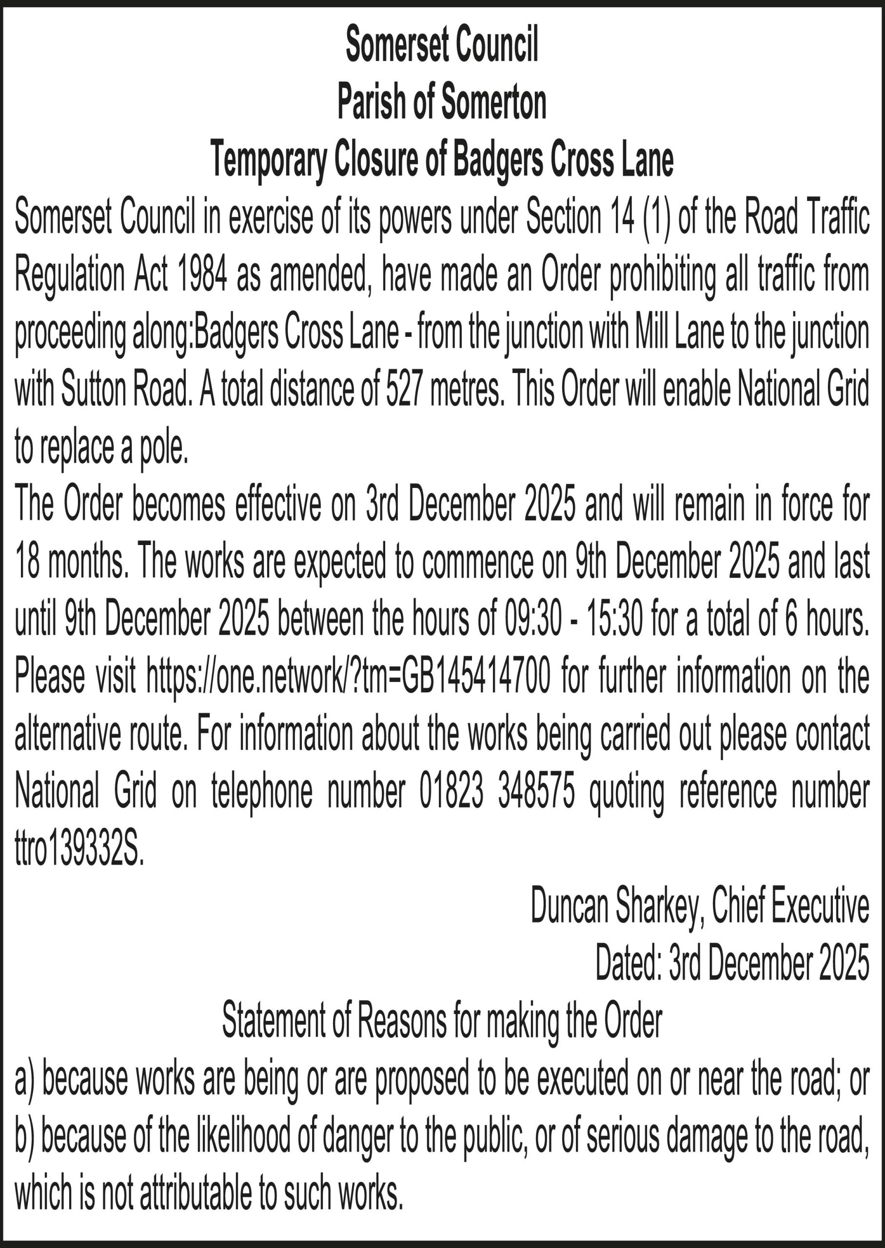 The Order becomes effective on 3rd December 2025 and will remain in force for 18 months. The works are expected to commence on 9th December 2025 and last until 9th December 2025 between the hours of 09:30 – 15:30 for a total of 6 hours. Please visit https://one.network/?tm=GB145414700 for further information on the alternative route. For information about the works being carried out please contact National Grid on telephone number 01823 348575 quoting reference number ttro139332S.