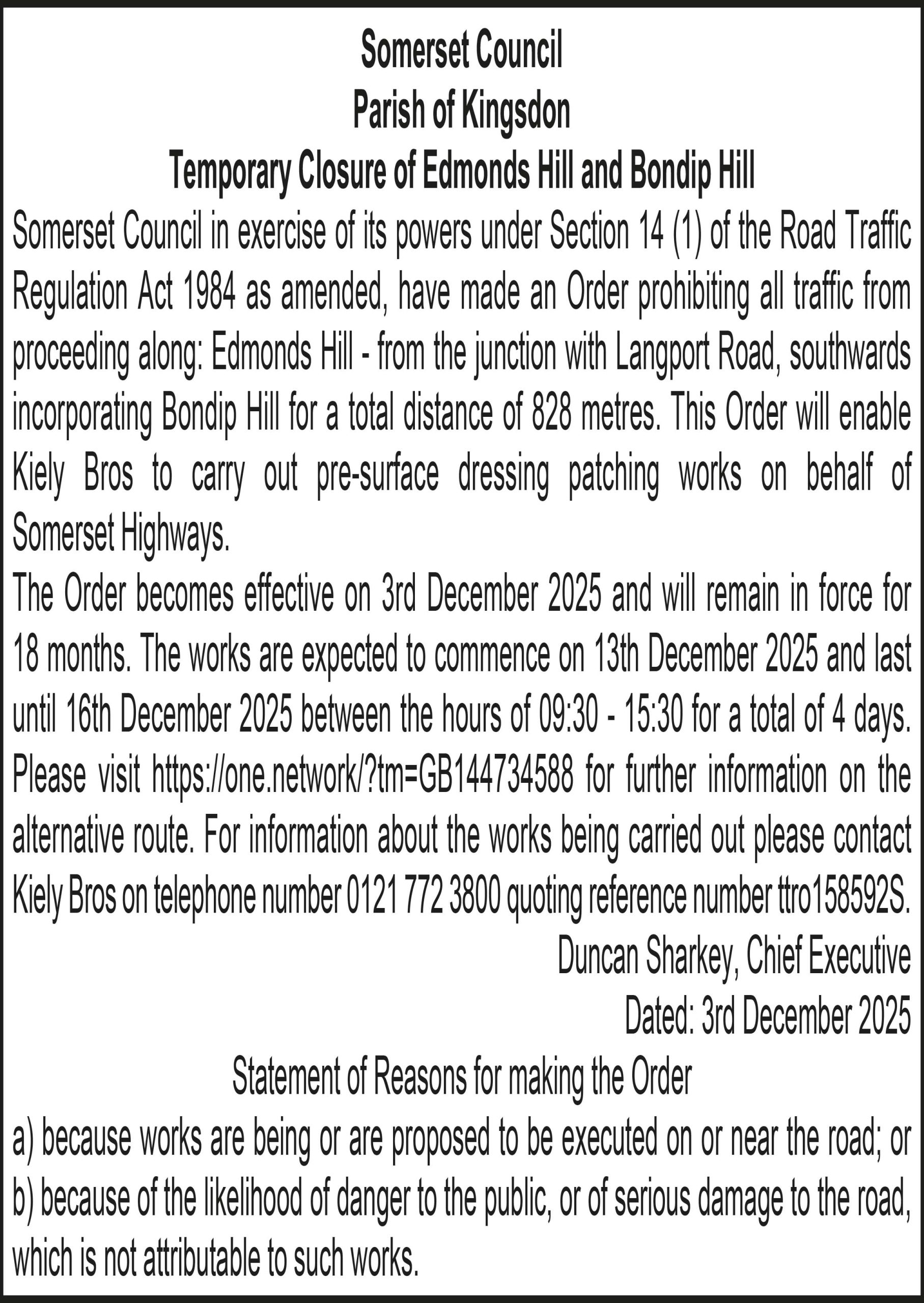 Somerset Council in exercise of its powers under Section 14 (1) of the Road Traffic Regulation Act 1984 as amended, have made an Order prohibiting all traffic from proceeding along: Edmonds Hill – from the junction with Langport Road, southwards incorporating Bondip Hill for a total distance of 828 metres. This Order will enable Kiely Bros to carry out pre-surface dressing patching works on behalf of Somerset Highways.
