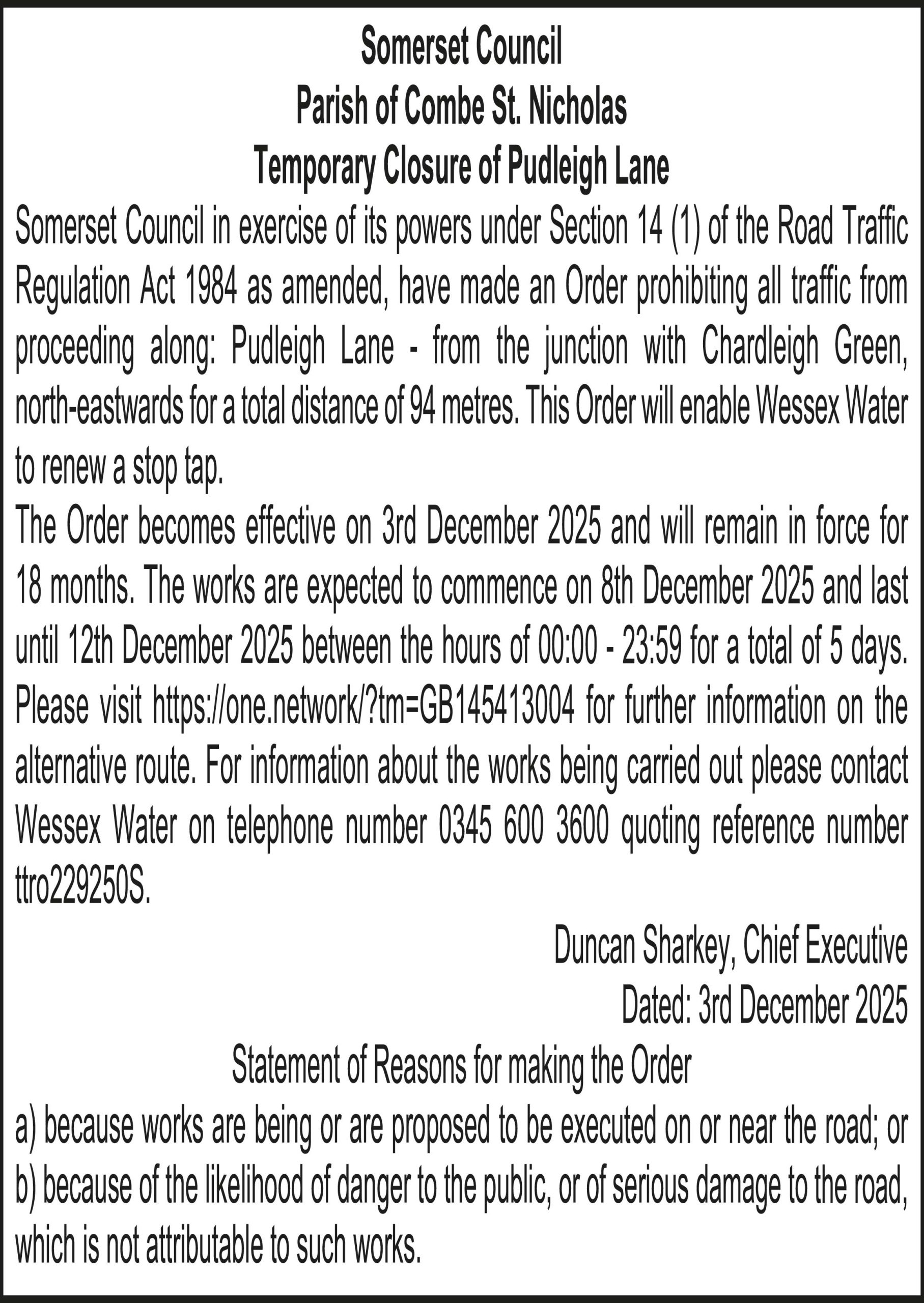 Somerset Council in exercise of its powers under Section 14 (1) of the Road Traffic Regulation Act 1984 as amended, have made an Order prohibiting all traffic from proceeding along: Pudleigh Lane – from the junction with Chardleigh Green, north-eastwards for a total distance of 94 metres. This Order will enable Wessex Water to renew a stop tap.