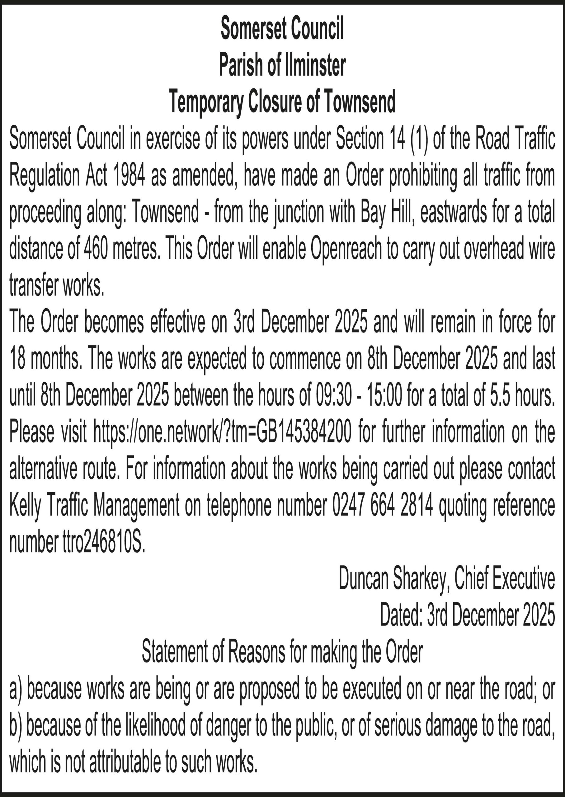 The Order becomes effective on 3rd December 2025 and will remain in force for 18 months. The works are expected to commence on 8th December 2025 and last until 8th December 2025 between the hours of 09:30 – 15:00 for a total of 5.5 hours. Please visit https://one.network/?tm=GB145384200 for further information on the alternative route. For information about the works being carried out please contact Kelly Traffic Management on telephone number 0247 664 2814 quoting reference number ttro246810S.