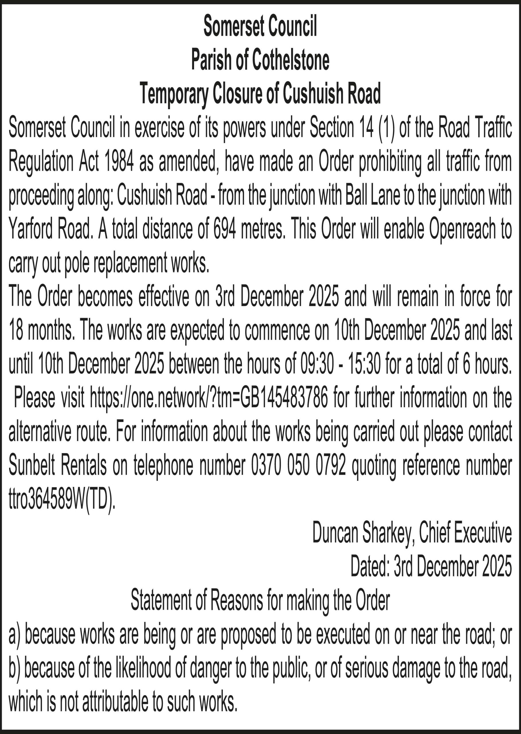 Somerset Council in exercise of its powers under Section 14 (1) of the Road Traffic Regulation Act 1984 as amended, have made an Order prohibiting all traffic from proceeding along: Cushuish Road – from the junction with Ball Lane to the junction with Yarford Road. A total distance of 694 metres. This Order will enable Openreach to carry out pole replacement works.