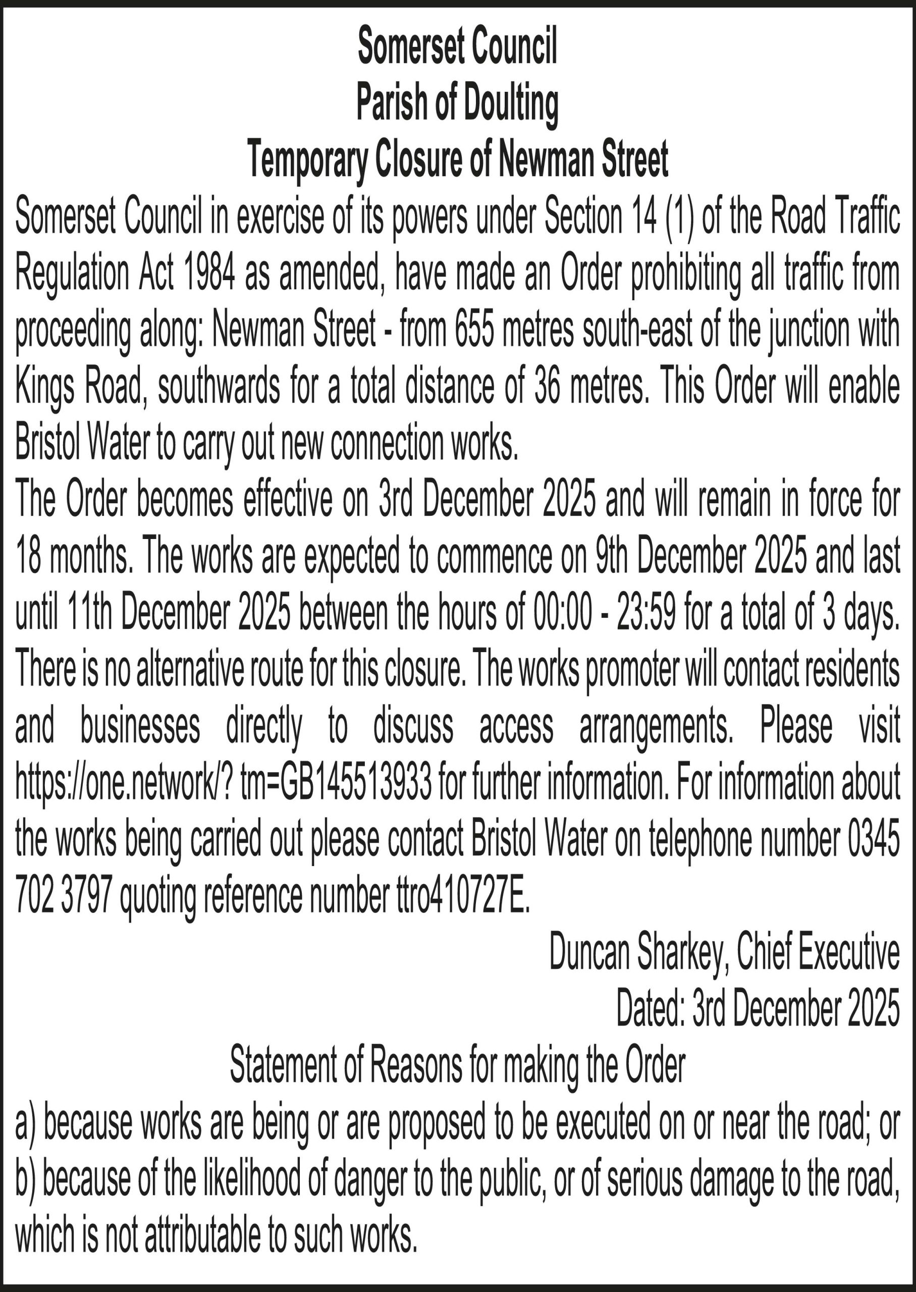 Somerset Council in exercise of its powers under Section 14 (1) of the Road Traffic Regulation Act 1984 as amended, have made an Order prohibiting all traffic from proceeding along: Newman Street – from 655 metres south-east of the junction with Kings Road, southwards for a total distance of 36 metres. This Order will enable Bristol Water to carry out new connection works.