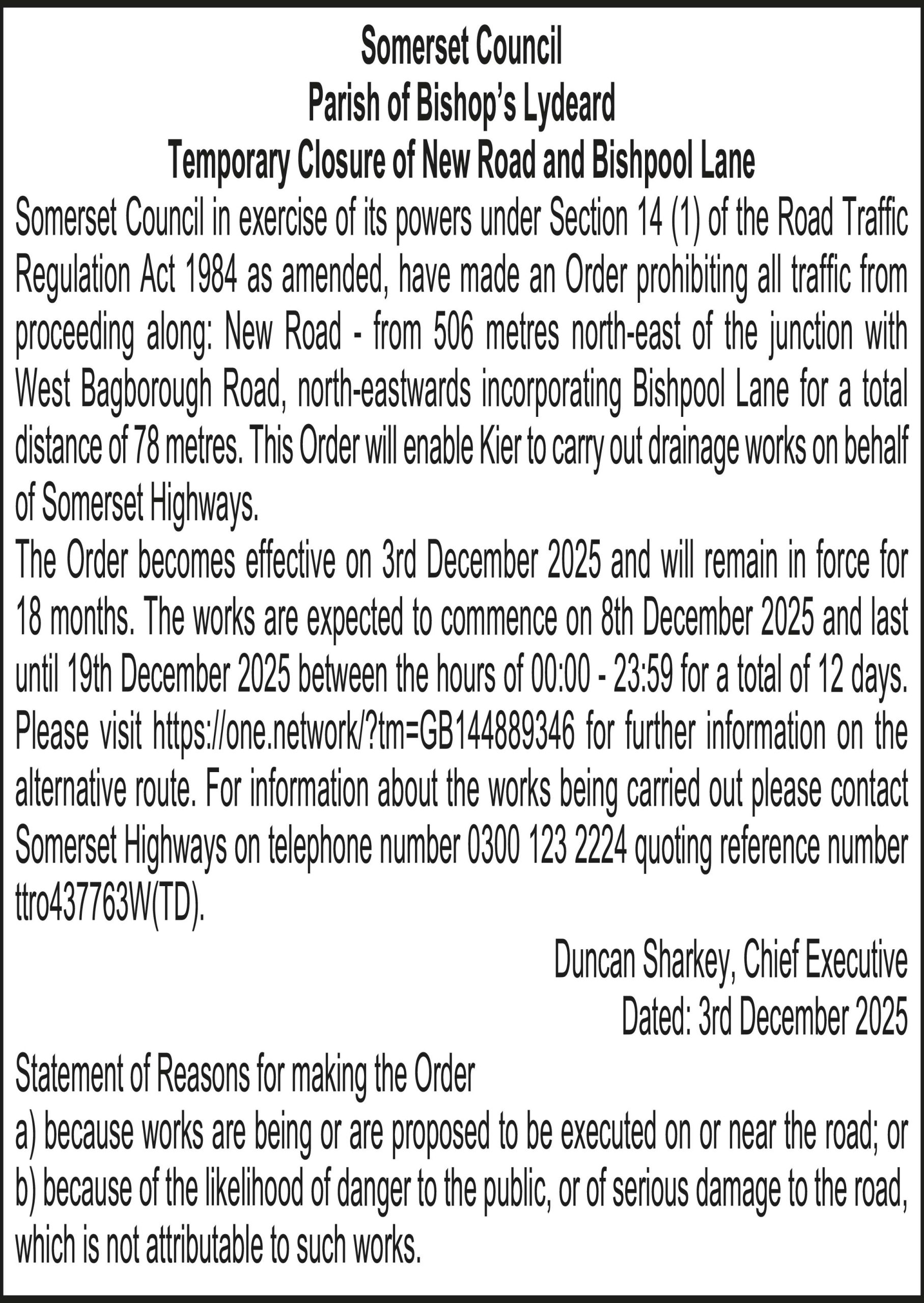 The Order becomes effective on 3rd December 2025 and will remain in force for 18 months. The works are expected to commence on 8th December 2025 and last until 19th December 2025 between the hours of 00:00 – 23:59 for a total of 12 days. Please visit https://one.network/?tm=GB144889346 for further information on the alternative route. For information about the works being carried out please contact Somerset Highways on telephone number 0300 123 2224 quoting reference number ttro437763W(TD).