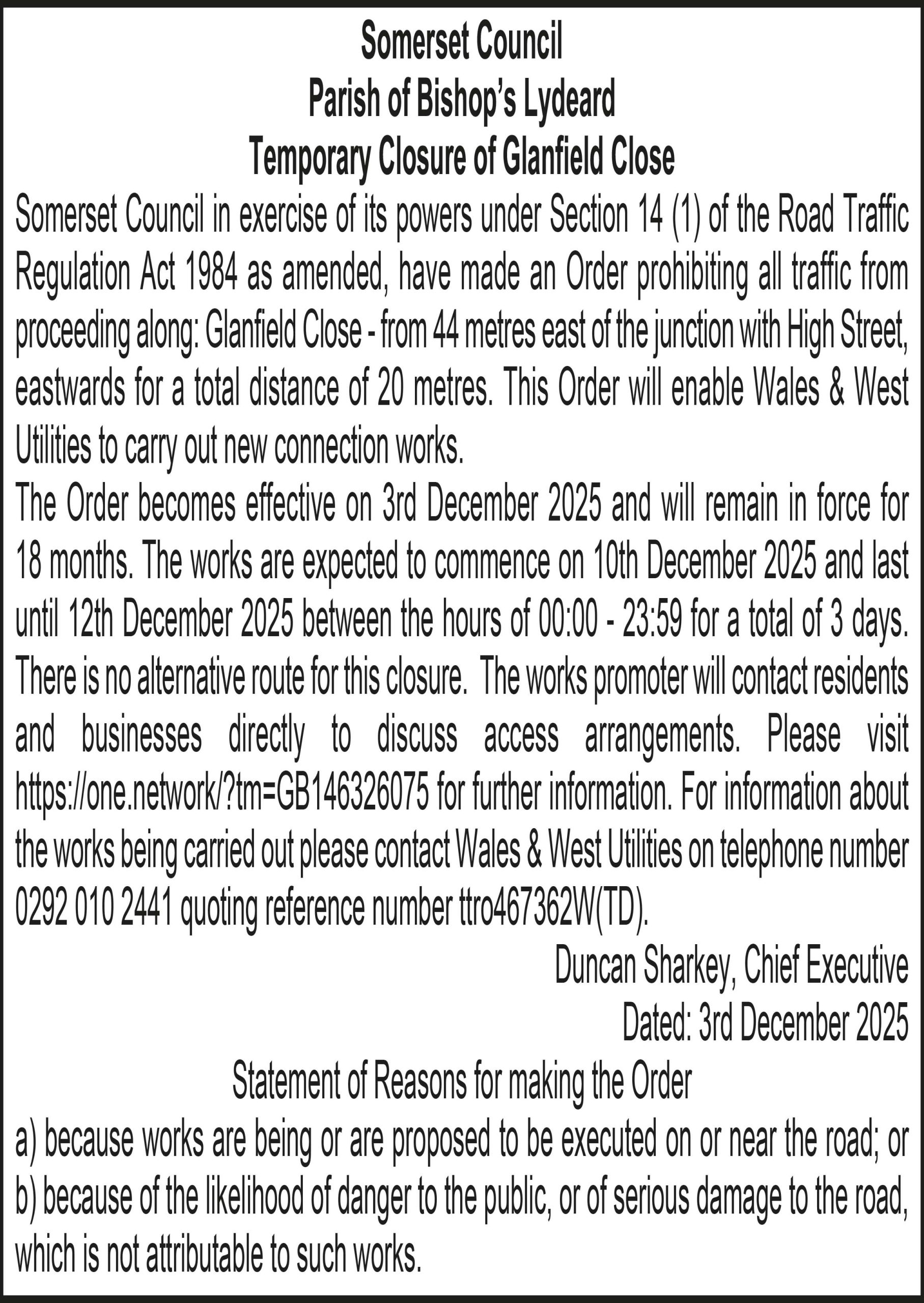 Somerset Council in exercise of its powers under Section 14 (1) of the Road Traffic Regulation Act 1984 as amended, have made an Order prohibiting all traffic from proceeding along: Glanfield Close – from 44 metres east of the junction with High Street, eastwards for a total distance of 20 metres. This Order will enable Wales & West Utilities to carry out new connection works.