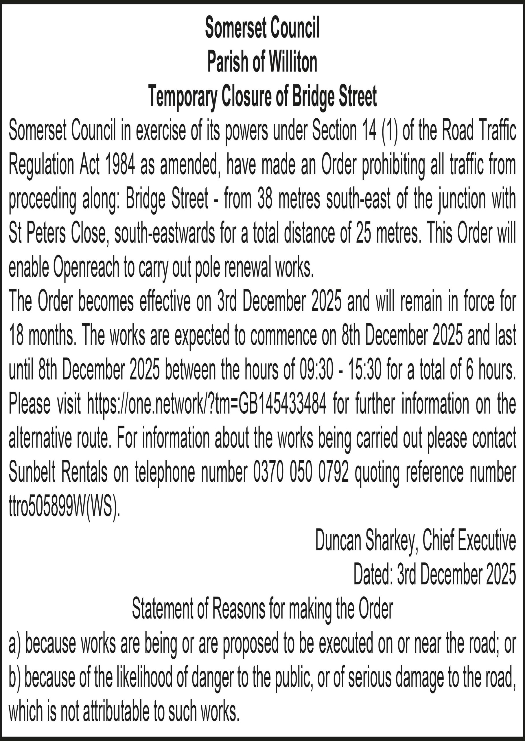 The Order becomes effective on 3rd December 2025 and will remain in force for 18 months. The works are expected to commence on 8th December 2025 and last until 8th December 2025 between the hours of 09:30 – 15:30 for a total of 6 hours. Please visit https://one.network/?tm=GB145433484 for further information on the alternative route. For information about the works being carried out please contact Sunbelt Rentals on telephone number 0370 050 0792 quoting reference number ttro505899W(WS).