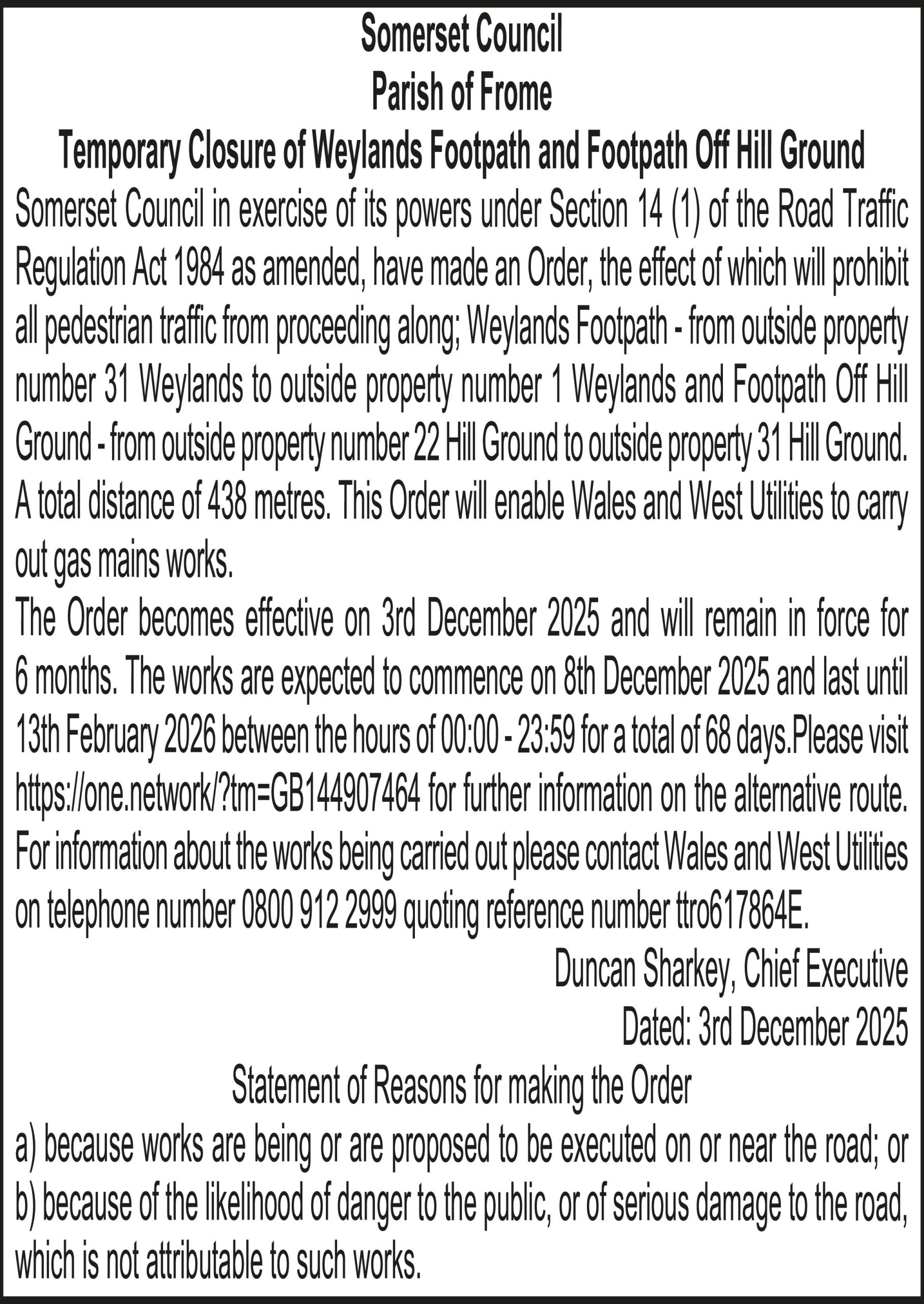 Somerset Council in exercise of its powers under Section 14 (1) of the Road Traffic Regulation Act 1984 as amended, have made an Order, the effect of which will prohibit all pedestrian traffic from proceeding along; Weylands Footpath – from outside property number 31 Weylands to outside property number 1 Weylands and Footpath Off Hill Ground – from outside property number 22 Hill Ground to outside property 31 Hill Ground. A total distance of 438 metres. This Order will enable Wales and West Utilities to carry out gas mains works.