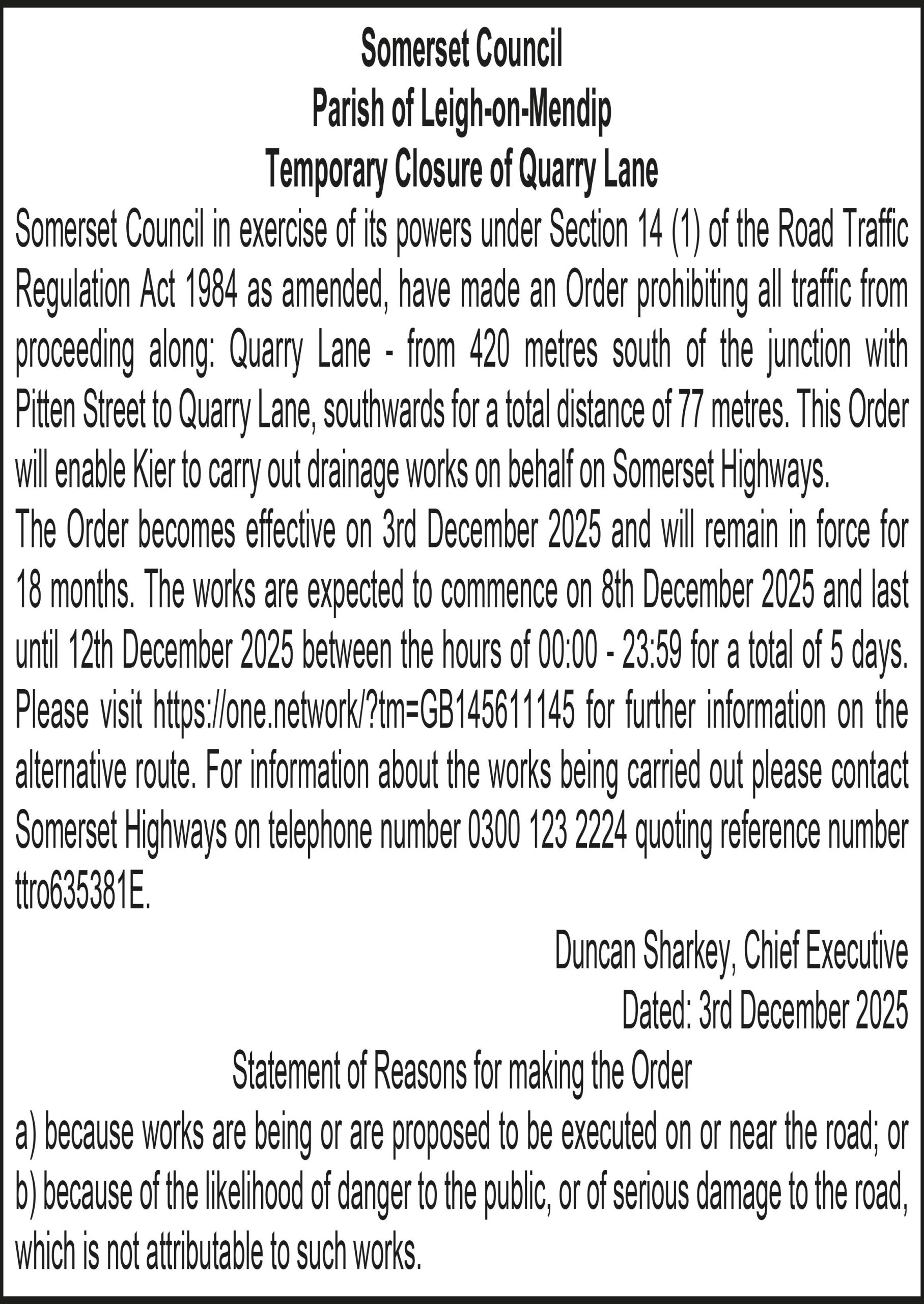 Somerset Council in exercise of its powers under Section 14 (1) of the Road Traffic Regulation Act 1984 as amended, have made an Order prohibiting all traffic from proceeding along: Quarry Lane – from 420 metres south of the junction with Pitten Street to Quarry Lane, southwards for a total distance of 77 metres. This Order will enable Kier to carry out drainage works on behalf on Somerset Highways.