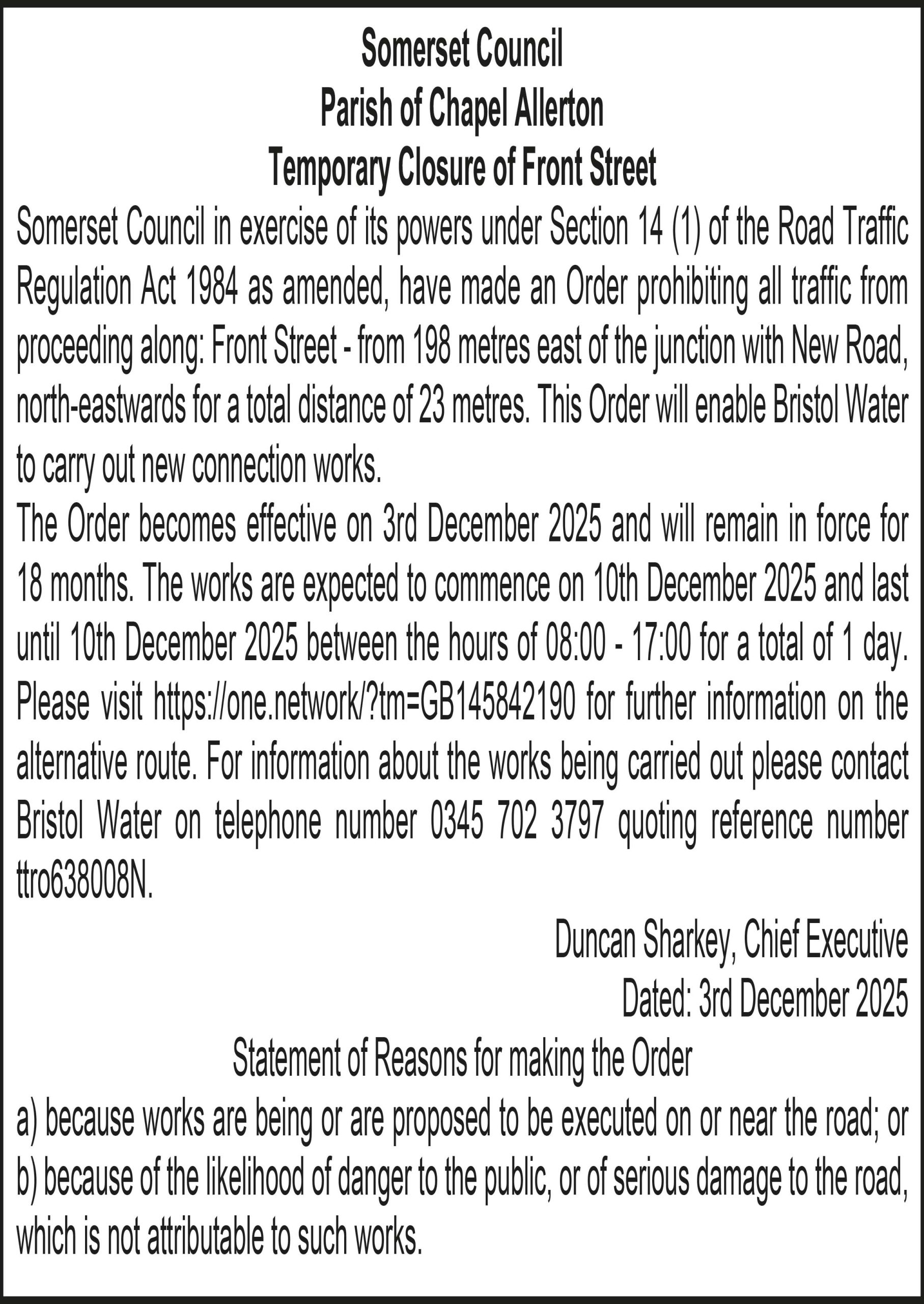 This Order will come into operation on the 3rd day of December 2025 and will remain in force for eighteen months. The Works are expected to commence on the 9th day of December 2025 until the 10th day of December 2025 (between 1800 hours and 0600 hours) to enable Wessex Water to carry out reinstatement works. The restrictions will only apply when indicated by traffic signs. Exemptions are provided in the Order for emergency vehicles. A copy of the draft Traffic Regulation Order and the associated plans can be examined at www.somerset.gov.uk/TRO . Please visit www.one.network for further information on the alternative route. For information about the works being carried out please contact Wessex Water, by telephone on 0345 6003600.