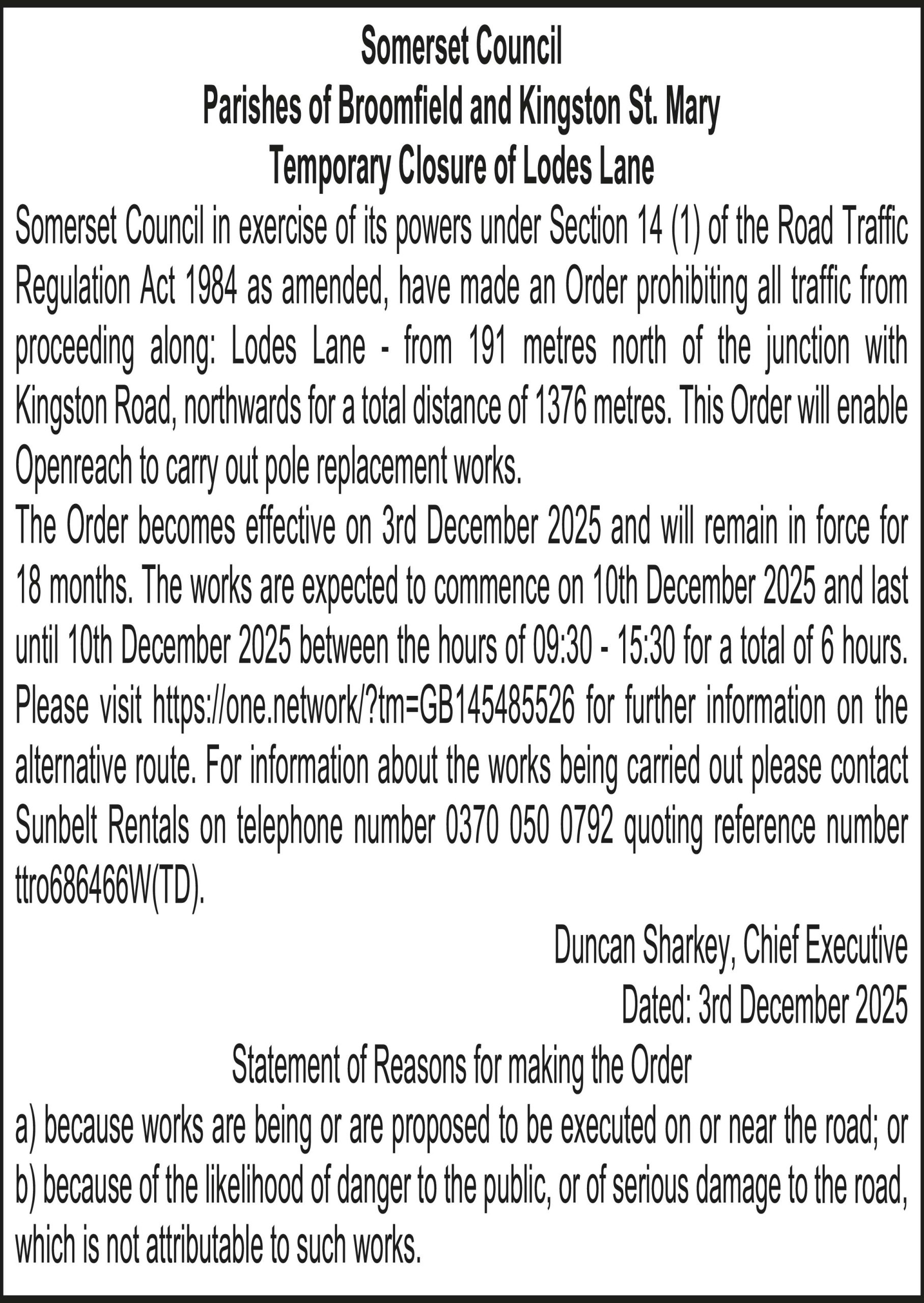 Somerset Council in exercise of its powers under Section 14 (1) of the Road Traffic Regulation Act 1984 as amended, have made an Order prohibiting all traffic from proceeding along: Lodes Lane – from 191 metres north of the junction with Kingston Road, northwards for a total distance of 1376 metres. This Order will enable Openreach to carry out pole replacement works.