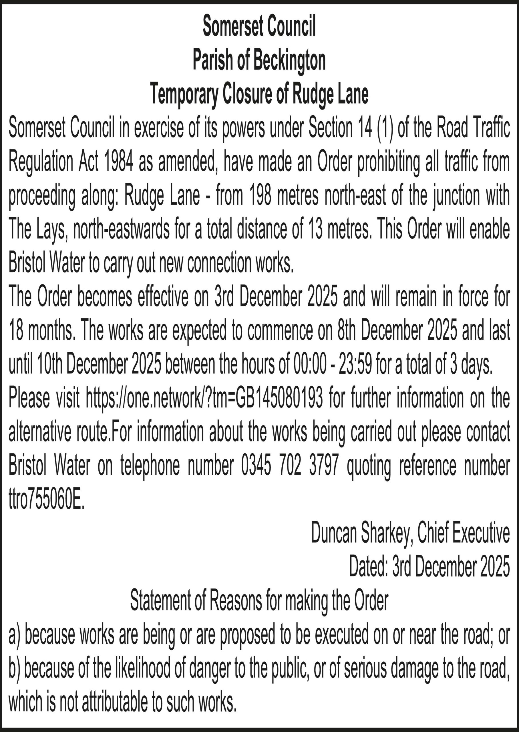 The Order becomes effective on 3rd December 2025 and will remain in force for 18 months. The works are expected to commence on 8th December 2025 and last until 10th December 2025 between the hours of 00:00 – 23:59 for a total of 3 days. Please visit https://one.network/?tm=GB145437521 for further information on the alternative route. For information about the works being carried out please contact Wessex Water on telephone number 0345 600 4600 quoting reference number ttro505901S.