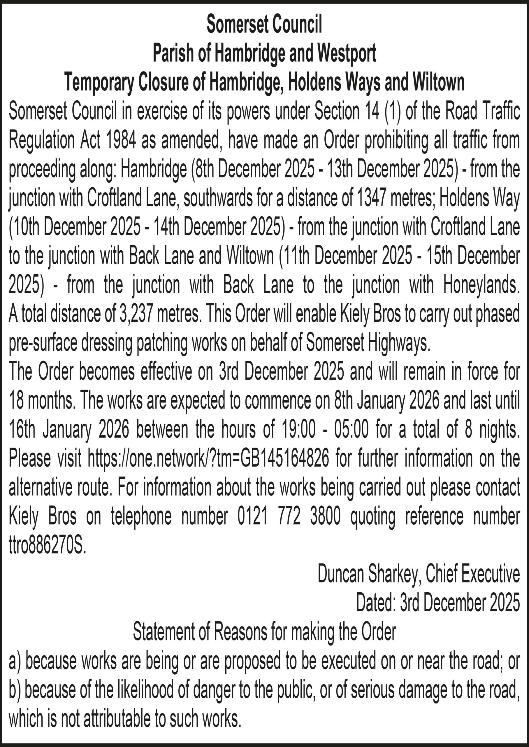 Somerset Council in exercise of its powers under Section 14 (1) of the Road Traffic Regulation Act 1984 as amended, have made an Order prohibiting all traffic from proceeding along: Hambridge (8th December 2025 – 13th December 2025) – from the junction with Croftland Lane, southwards for a distance of 1347 metres; Holdens Way (10th December 2025 – 14th December 2025) – from the junction with Croftland Lane to the junction with Back Lane and Wiltown (11th December 2025 – 15th December 2025) – from the junction with Back Lane to the junction with Honeylands. A total distance of 3,237 metres. This Order will enable Kiely Bros to carry out phased pre-surface dressing patching works on behalf of Somerset Highways.