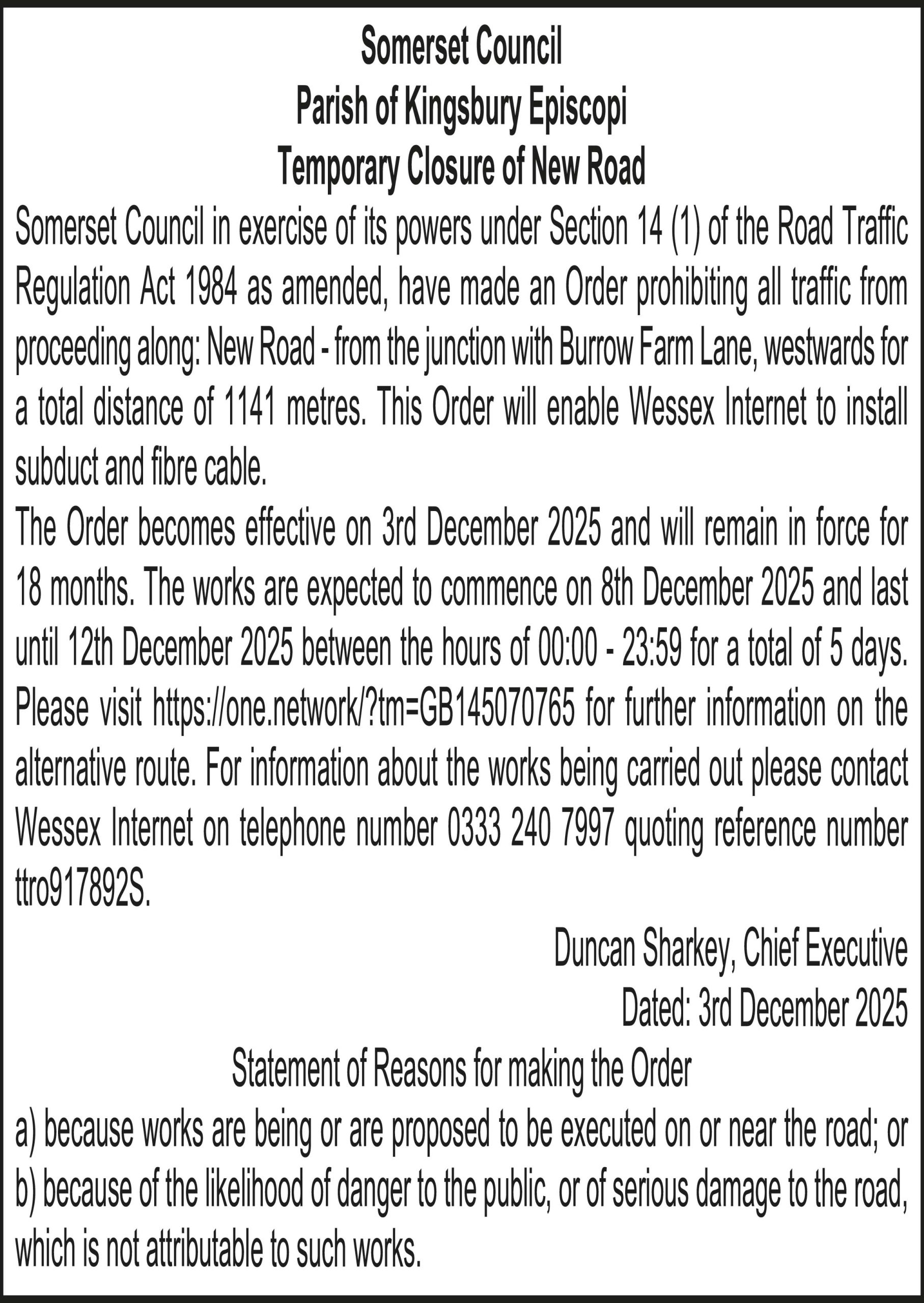 The Order becomes effective on 3rd December 2025 and will remain in force for 18 months. The works are expected to commence on 8th December 2025 and last until 12th December 2025 between the hours of 00:00 – 23:59 for a total of 5 days. Please visit https://one.network/?tm=GB145070765 for further information on the alternative route. For information about the works being carried out please contact Wessex Internet on telephone number 0333 240 7997 quoting reference number ttro917892S.