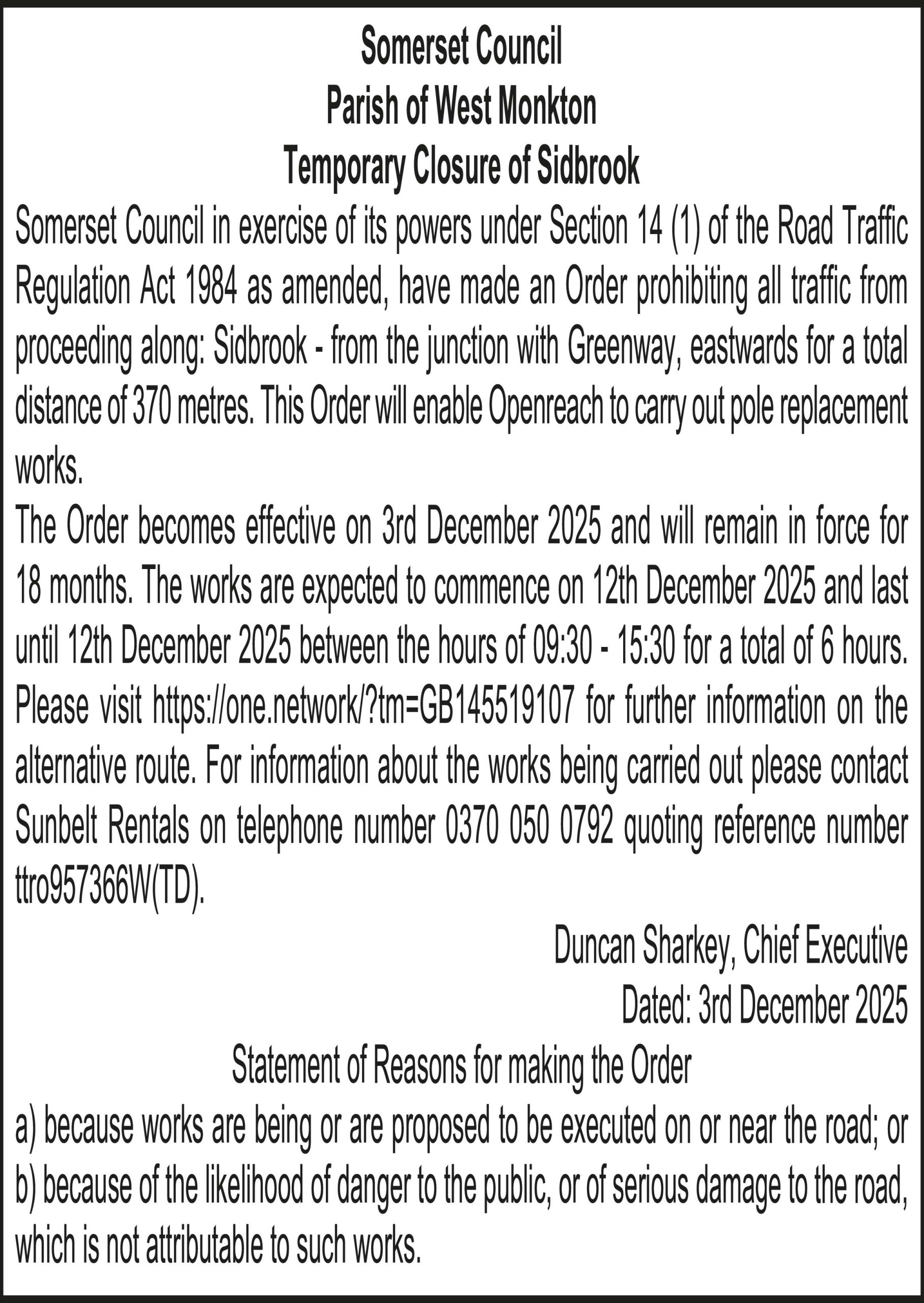 Somerset Council in exercise of its powers under Section 14 (1) of the Road Traffic Regulation Act 1984 as amended, have made an Order prohibiting all traffic from proceeding along: Sidbrook – from the junction with Greenway, eastwards for a total distance of 370 metres. This Order will enable Openreach to carry out pole replacement works.